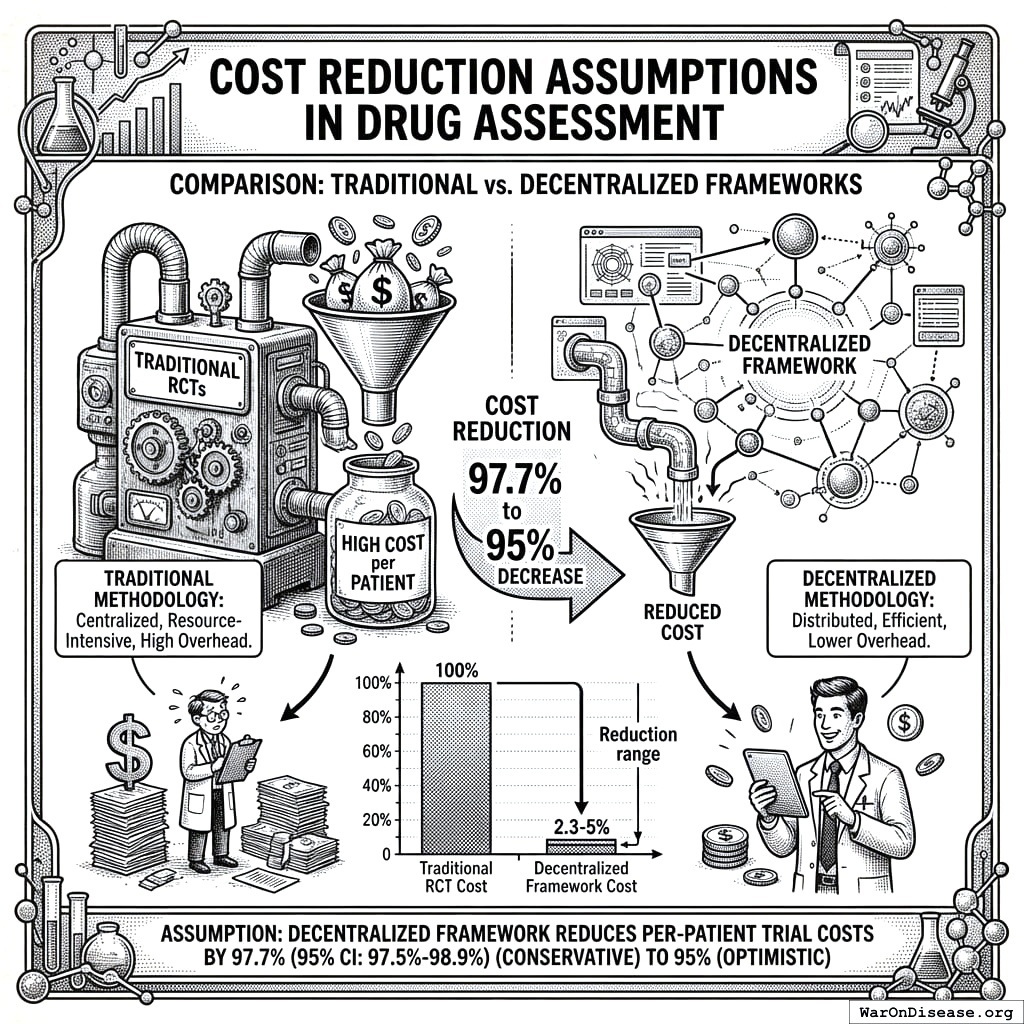 2. Clinical trial market price effects: Increasing trial demand by 12.3x (95% CI: 4.2x-61.4x) could affect equilibrium prices for clinical research services. However, the pragmatic trial approach reduces per-trial costs (82x (95% CI: 50x-94.1x) cheaper via automation), suggesting supply constraints may not bind. Traditional trials cost $41K (95% CI: $20K-$120K); decentralized trials target $929 (95% CI: $97-$3K) by eliminating overhead, not by increasing demand for scarce inputs.
