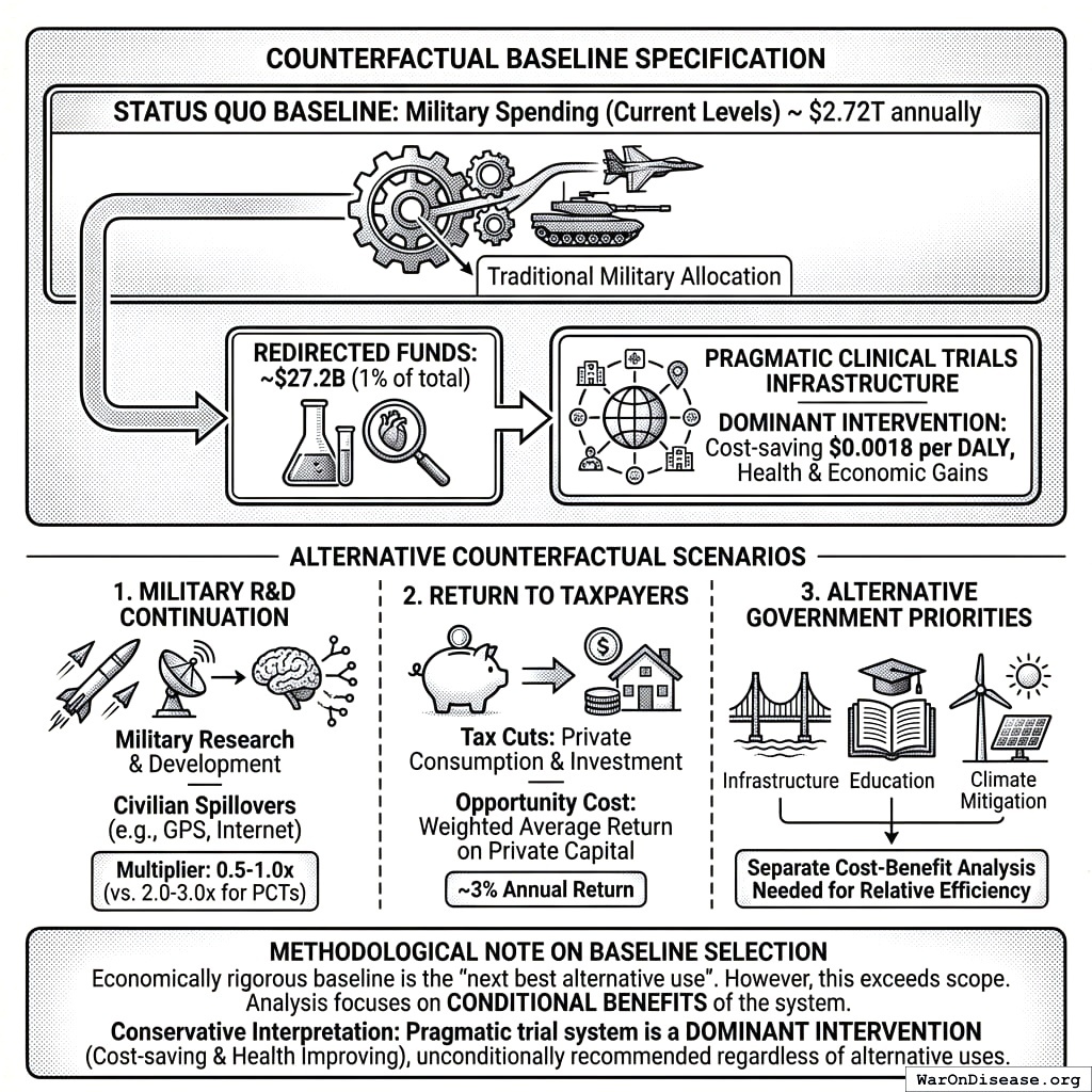 This analysis employs partial equilibrium methodology, holding prices and market structures constant while evaluating the intervention’s direct effects. General equilibrium analysis would account for market adjustments to the $27.2B annual reallocation from military to pragmatic clinical trials spending.