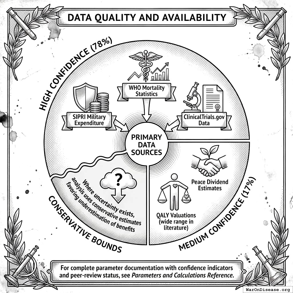 Methods: Cost-benefit analysis, NPV calculations, QALY modeling, and ICER analysis using SIPRI military expenditure data, WHO mortality statistics, Harvard meta-analysis of 108 embedded pragmatic trials142, and published clinical trial cost literature. Conservative estimates exclude research acceleration effects; complete estimates include all quantifiable benefits. All parameters, data sources, and uncertainty ranges documented in Parameters and Calculations.
