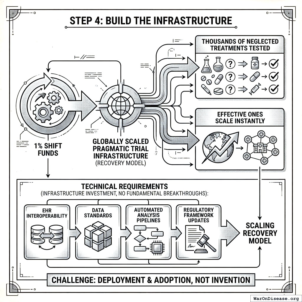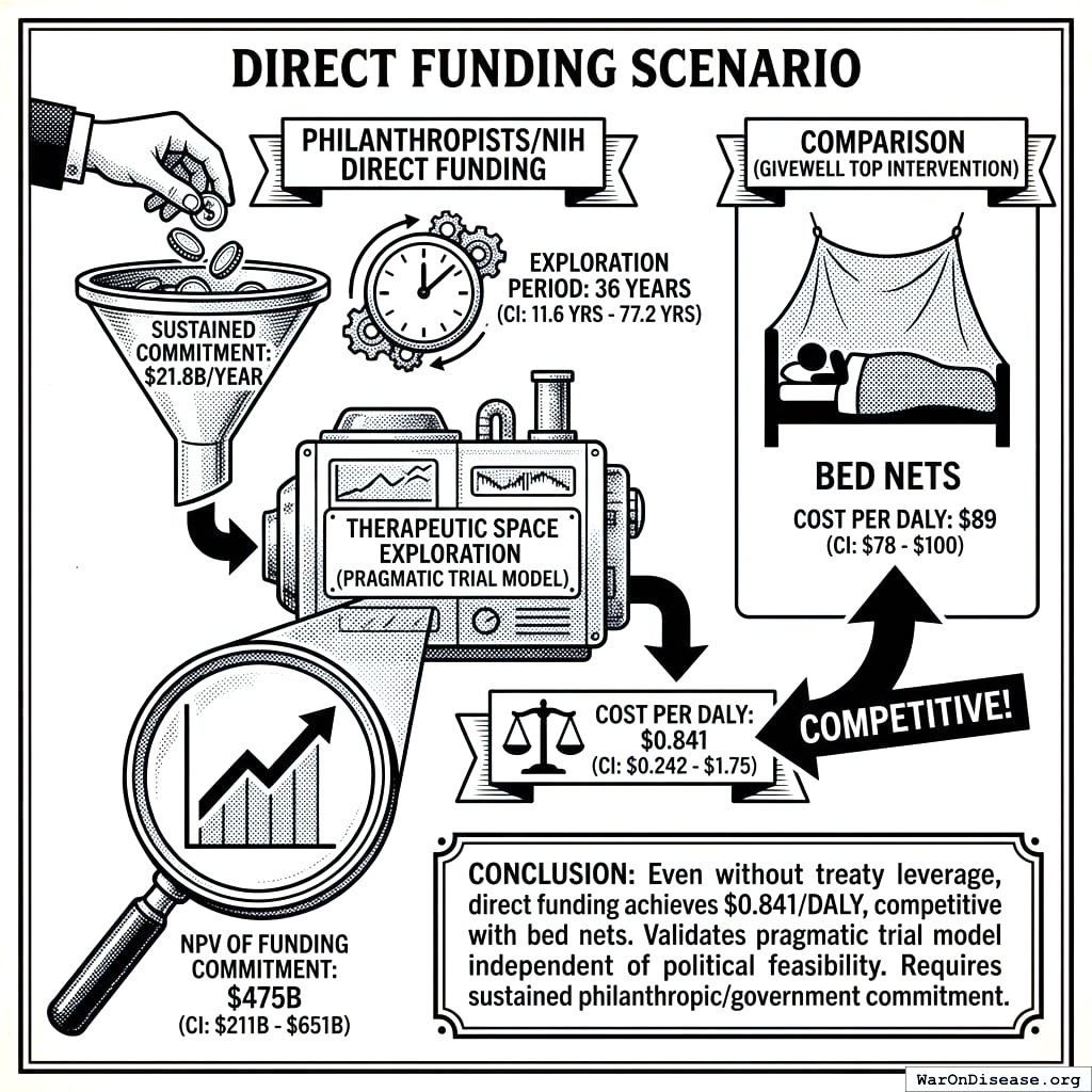 The solution: Redirecting 1% of global military spending ($27.2B/year) to pragmatic clinical trials increases capacity 12.3x (95% CI: 4.2x-61.4x) (to ~185 diseases/year (95% CI: 107 diseases/year-491 diseases/year) treatments/year). Pragmatic trials cost $929 (95% CI: $97-$3K)/patient versus $41K (95% CI: $20K-$120K)/patient for traditional trials, enabling vastly more parallel research. This reduces time to explore all therapeutic possibilities from ~443 years (95% CI: 324 years-712 years) to ~36 years (95% CI: 11.6 years-77.1 years).