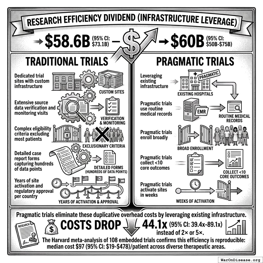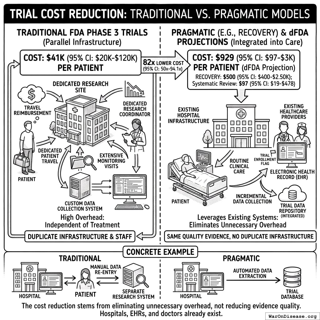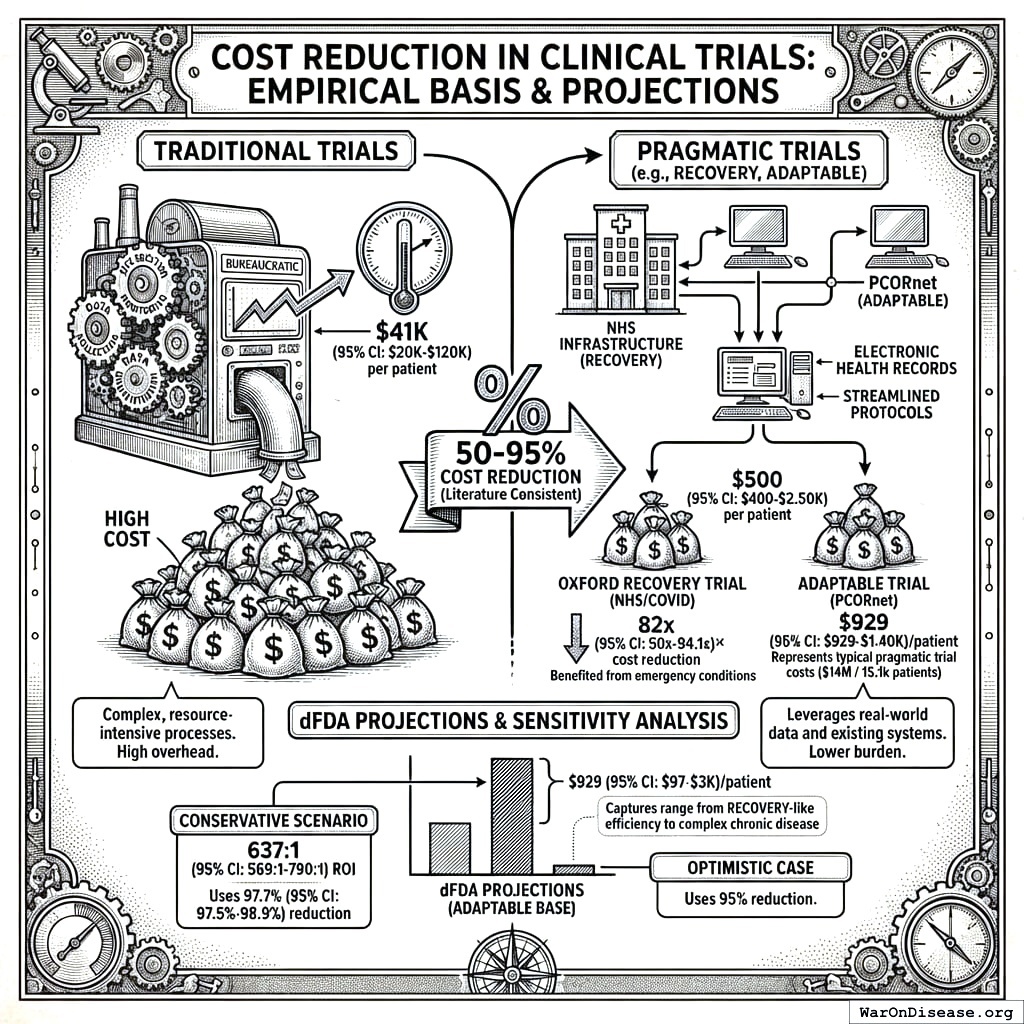 Multiple large-scale pragmatic trials and systematic reviews demonstrate that pragmatic trial design maintains scientific rigor while dramatically reducing costs. A Harvard review of 108 embedded pragmatic trials (64 with cost data) found median costs of $97/patient142. The Oxford RECOVERY trial achieved $500 (95% CI: $400-$2.5K)/patient (under exceptional NHS/COVID conditions), while the PCORnet ADAPTABLE trial achieved $929 (95% CI: $929-$1.4K)/patient under normal conditions1. Our system projections use the conservative ADAPTABLE estimate ($929 (95% CI: $97-$3K)/patient). This 44.1x (95% CI: 39.4x-89.1x) cost reduction transforms the economics of medical research: what was previously too expensive to test becomes systematically explorable.