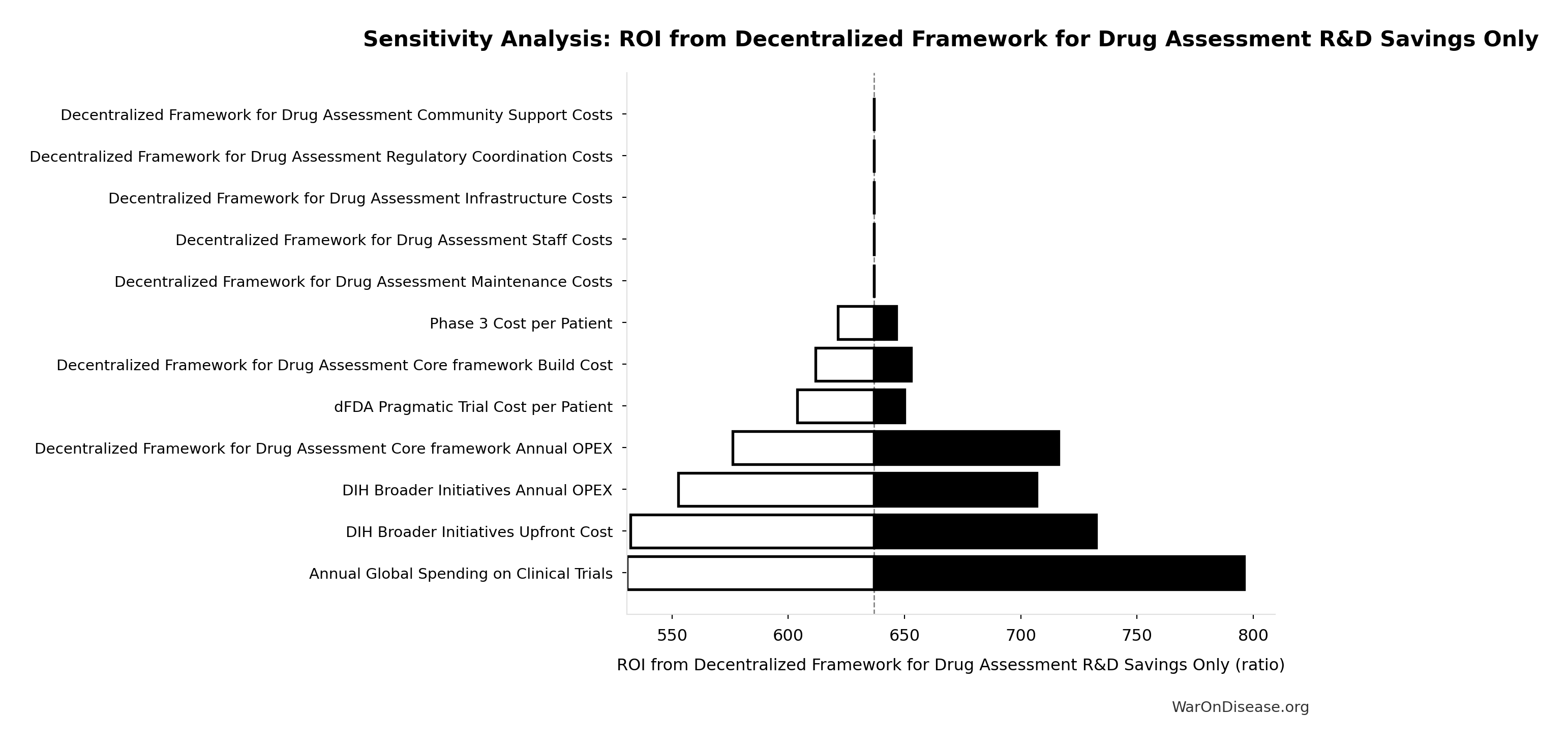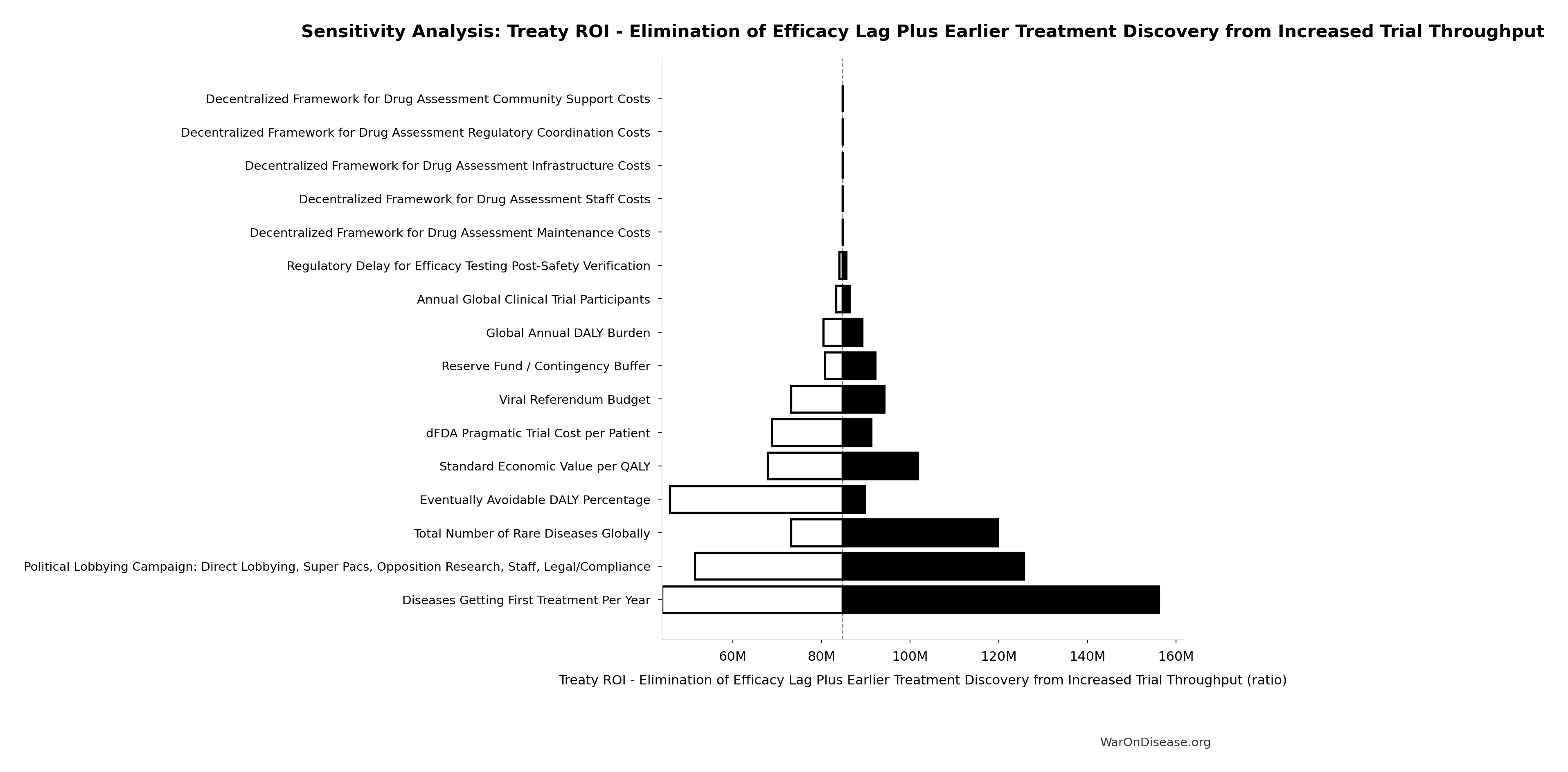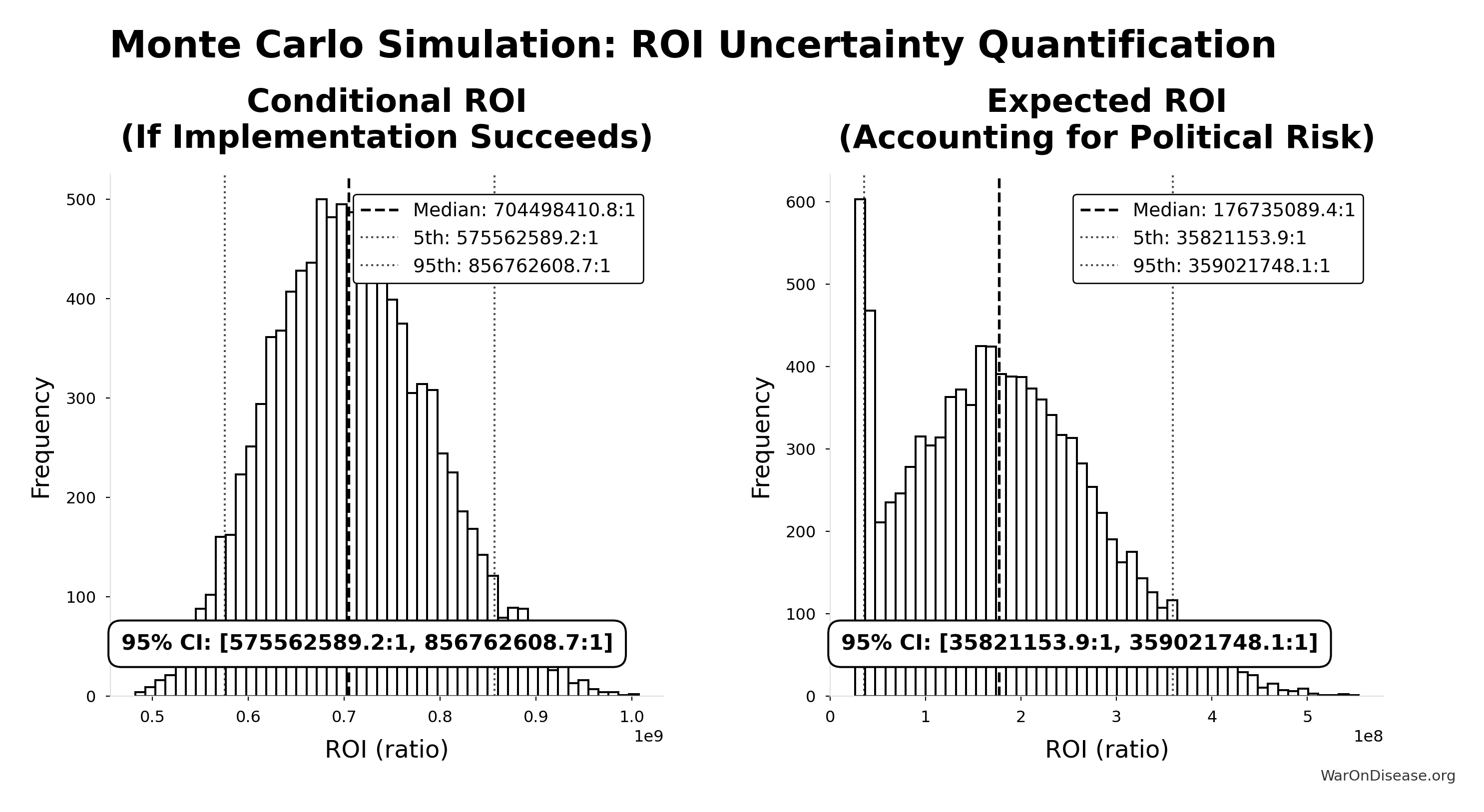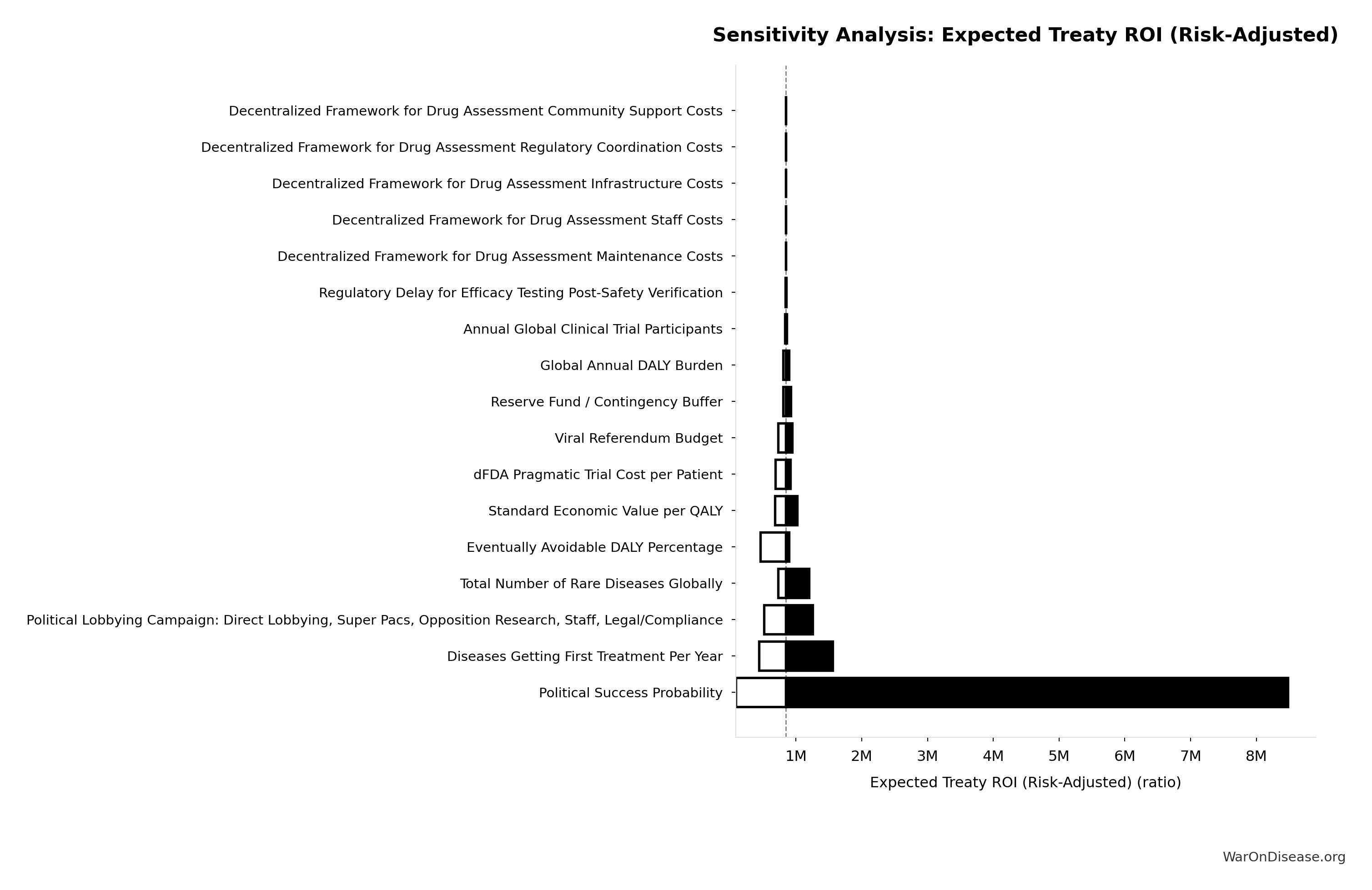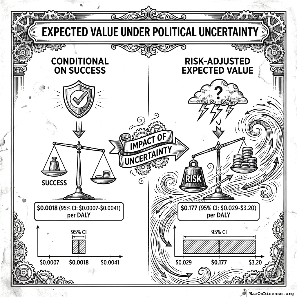 Robustness: Even under pessimistic assumptions with multiple adverse conditions simultaneously occurring, the intervention generates positive returns exceeding most established public health programs. The tornado chart for DFDA_EXPECTED_ROI shows that political success probability is the primary driver of uncertainty.