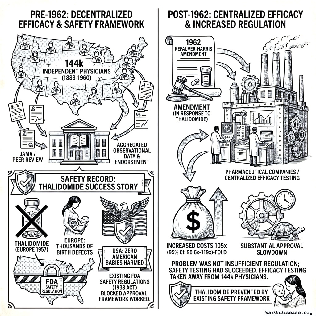 Phase I safety testing remains mandatory. This is the testing that prevented thalidomide in the United States. What changes is eliminating the 8.2 years (95% CI: 4.85 years-11.5 years) efficacy delay (Phase II/III) after safety is verified.