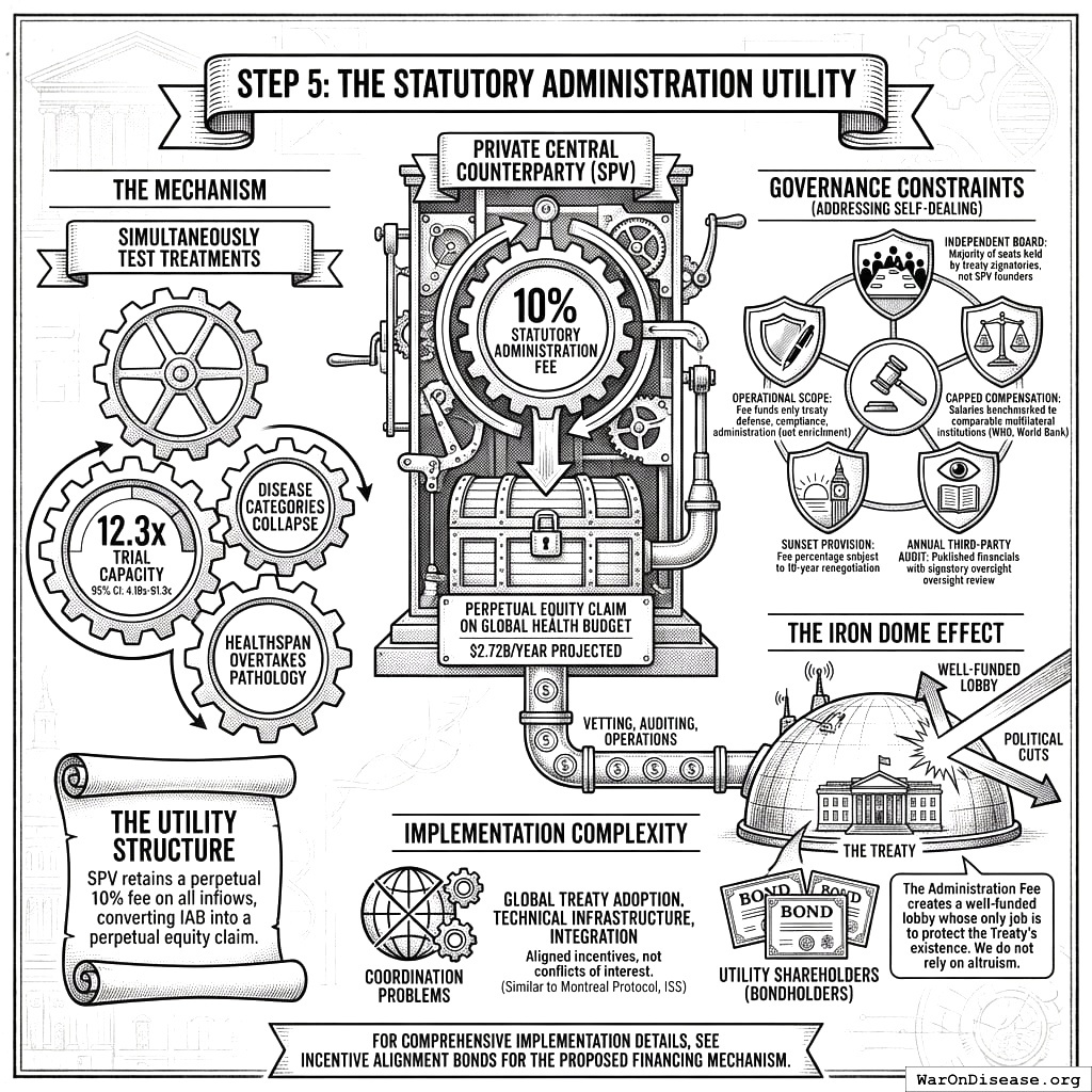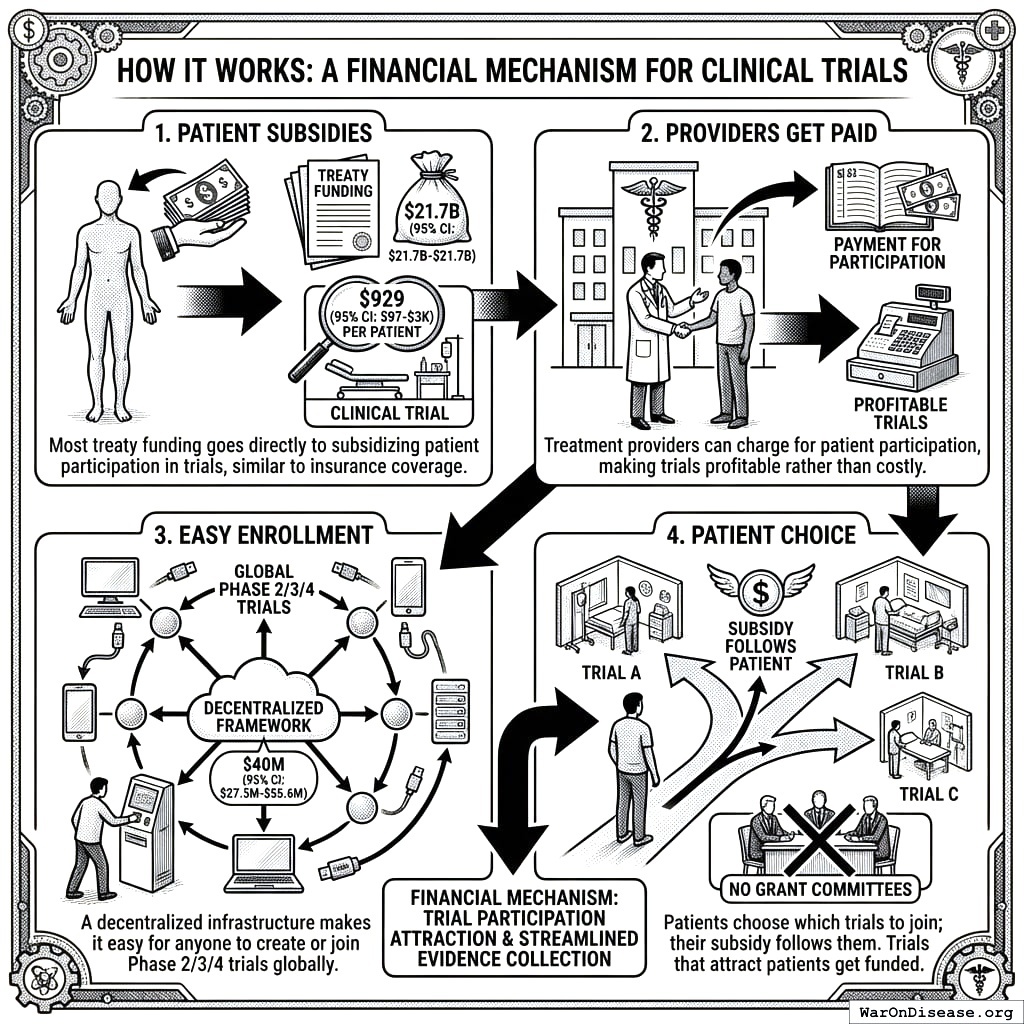 4. Aligned incentives: The 1% Treaty proposes Incentive Alignment Bonds: a single instrument that aligns investors (10% allocation, projected 272% returns), politicians (10% political incentive fund), and patients (80% pragmatic trials) with the same outcome, rather than relying on altruism or bureaucratic mandate.