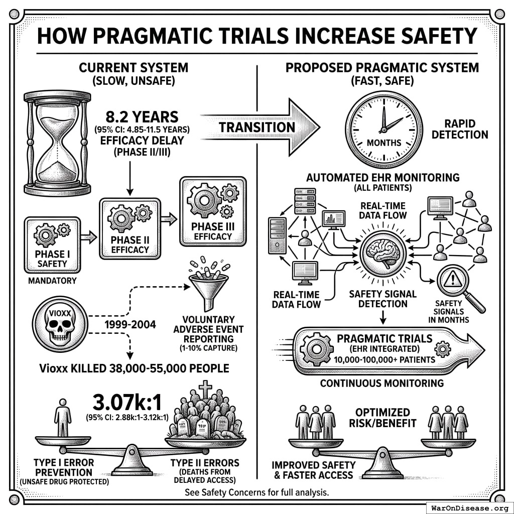 For every person protected from an unsafe drug (Type I error prevention), the current system kills 3.07k (95% CI: 2.88k-3.12k) people by delaying access to beneficial treatments (Type II errors). See Safety Concerns for full analysis.