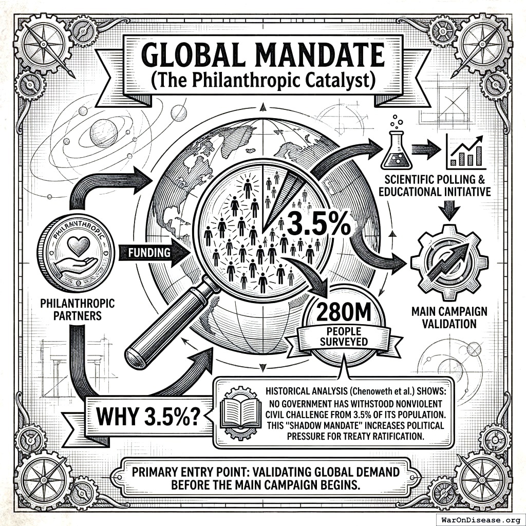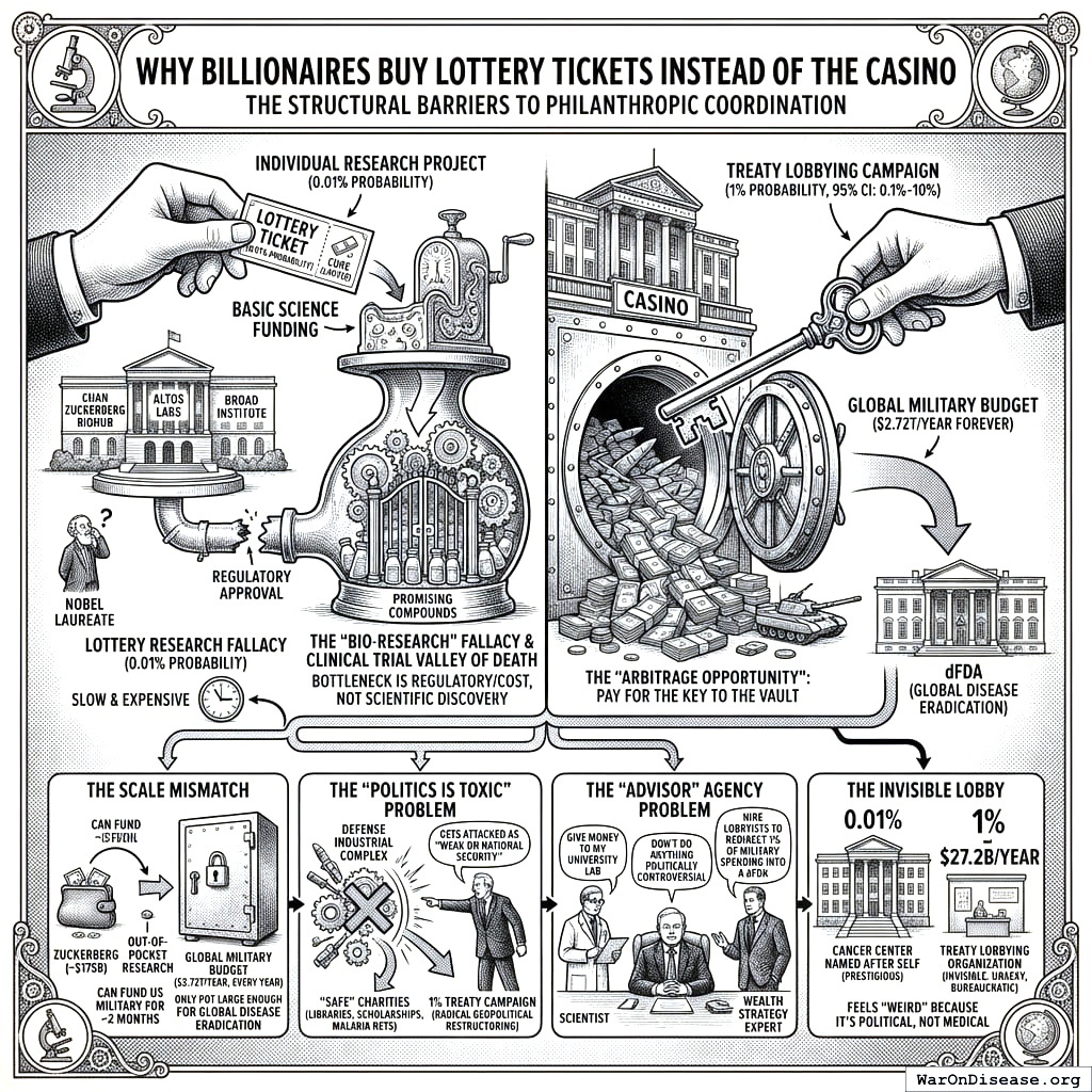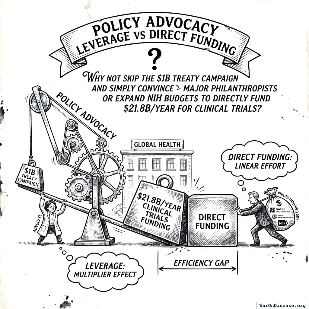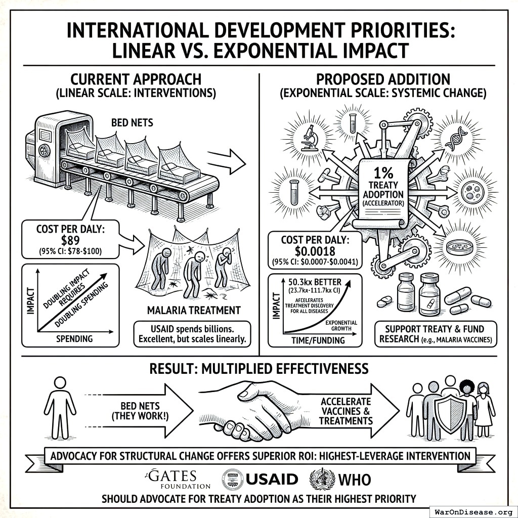 The Gates Foundation, USAID, and WHO should advocate for treaty adoption as their highest-leverage intervention: it multiplies the effectiveness of everything else they fund. The Gates Foundation’s historical pattern (spending billions on individual disease programs when the same capital could lobby for treaty passage and unlock $27.2B/year in government funding) exemplifies the “lottery tickets vs casino” problem described earlier. Advocacy for structural change offers superior ROI to direct program spending.