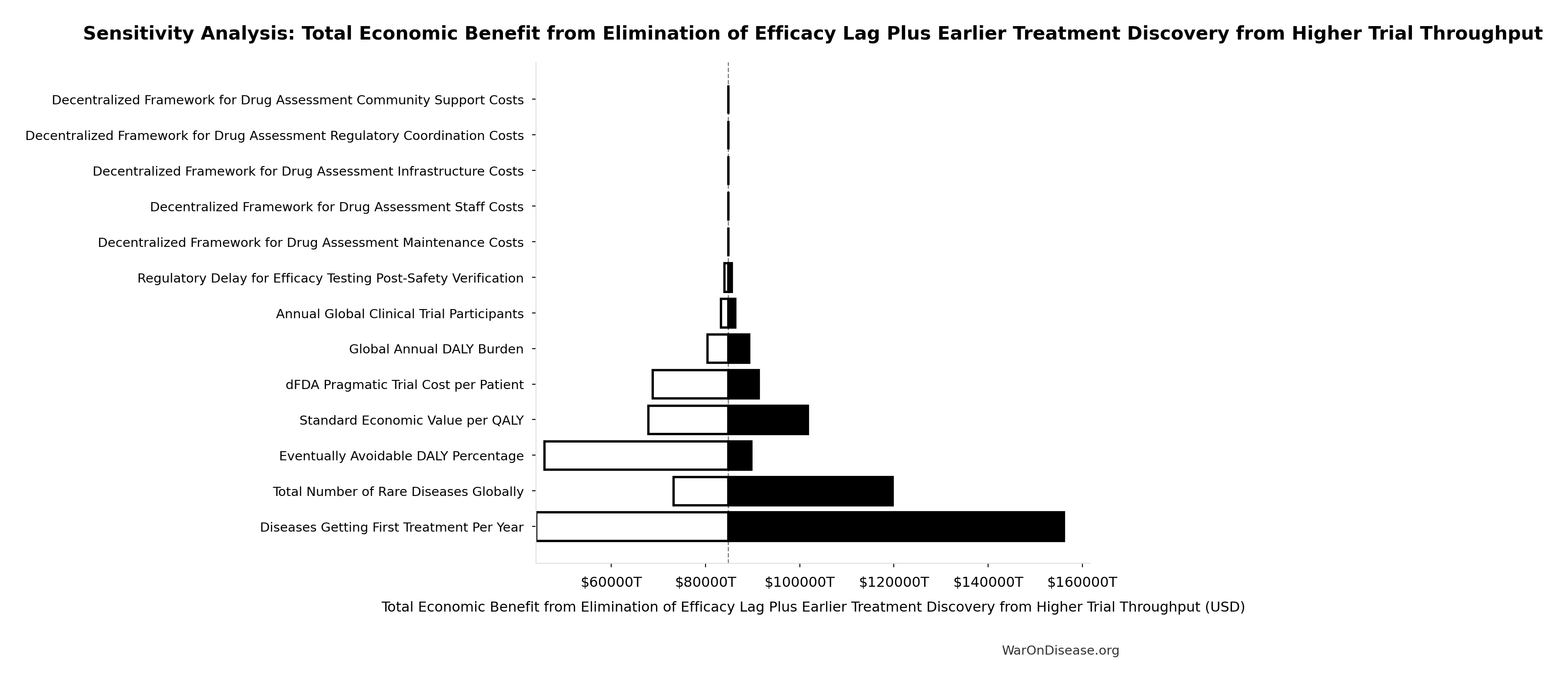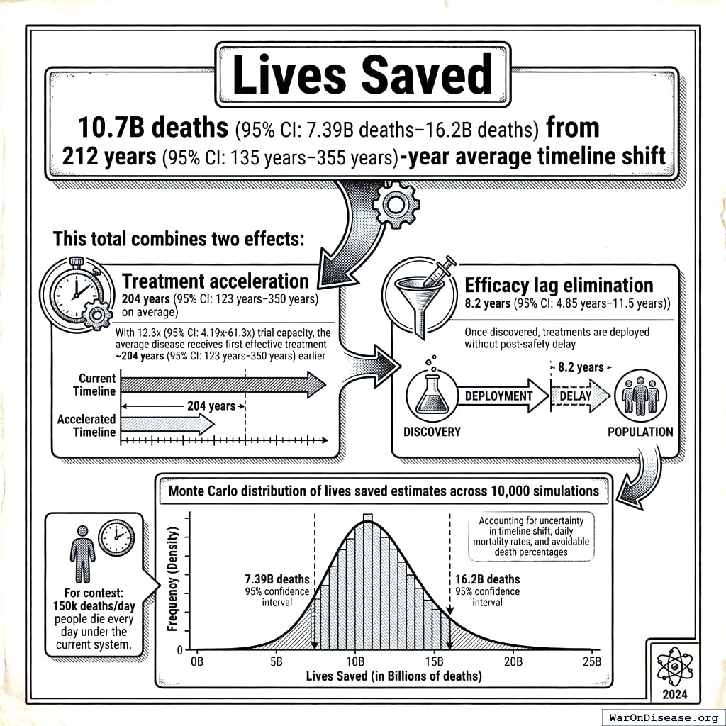 The impact: Treatments that would have taken decades to even begin researching under the status quo get discovered and delivered decades earlier. Combined with eliminating the 8.2 years (95% CI: 4.85 years-11.5 years) regulatory efficacy delay (via opt-in access to ubiquitous trials after Phase I safety), the average treatment reaches patients 212 years (95% CI: 135 years-355 years) sooner. This timeline shift saves 10.7 billion deaths (95% CI: 7.4 billion deaths-16.2 billion deaths), valued at $84.8 quadrillion (95% CI: $62.4 quadrillion-$97.3 quadrillion).