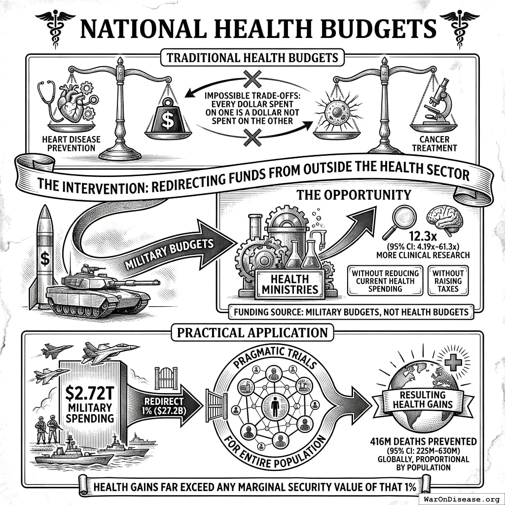 Practical application: A nation spending $2.72T on military could redirect 1% ($27.2B) to fund pragmatic trials for its entire population while maintaining virtually all of its military capacity. The resulting health gains (416 million (95% CI: 225 million-630 million) lives saved globally, proportional by population) far exceed any marginal security value of that 1%.