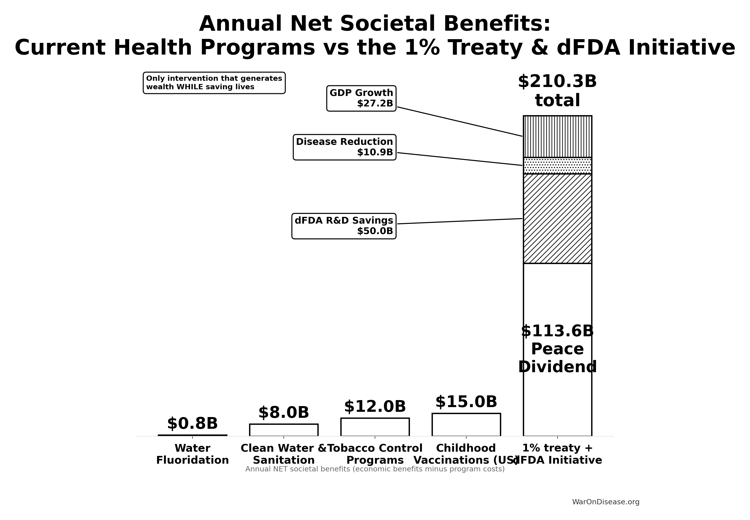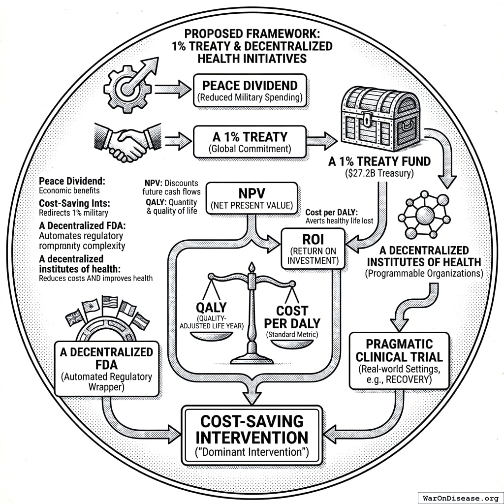 war-on-disease, 1-percent-treaty, medical-research, public-health, peace-dividend, decentralized-trials, dfda, dih, victory-bonds, health-economics, cost-benefit-analysis, clinical-trials, drug-development, regulatory-reform, military-spending, peace-economics, decentralized-governance, wishocracy, blockchain-governance, impact-investing