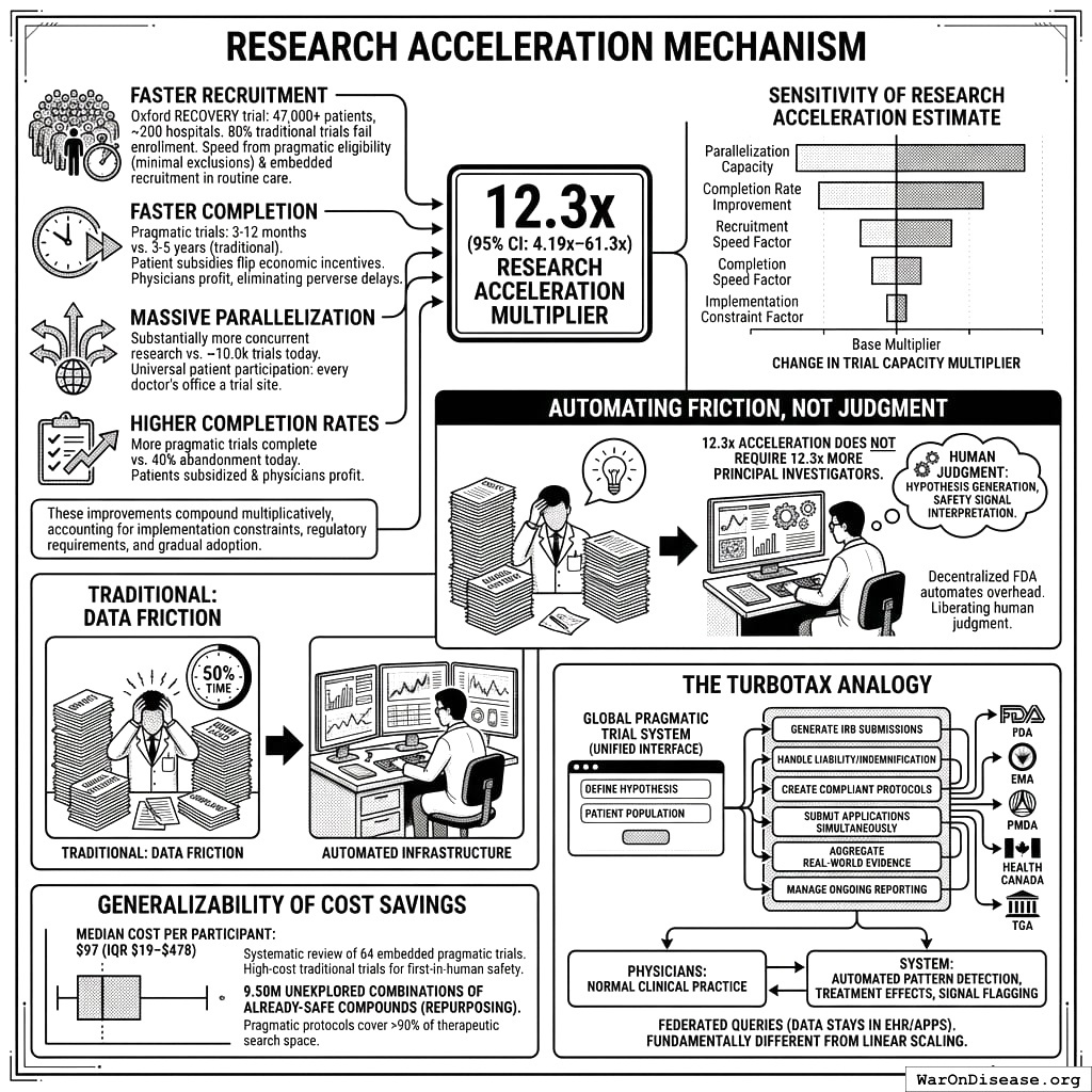 How the 12.3x (95% CI: 4.2x-61.4x) capacity increase works: Redirecting $27.2B/year at $929 (95% CI: $97-$3K)/patient (based on ADAPTABLE trial; RECOVERY achieved $500 (95% CI: $400-$2.5K)/patient under exceptional NHS/COVID conditions) enables 23.4 million patients/year (95% CI: 9.44 million patients/year-96.8 million patients/year) annual trial participants vs. current 1.9 million patients/year (95% CI: 1.5 million patients/year-2.3 million patients/year), increasing trial completion rate from 15 diseases/year (95% CI: 8 diseases/year-30 diseases/year) to 185 diseases/year (95% CI: 107 diseases/year-491 diseases/year). This removes the primary bottleneck to medical progress: currently less than 0.06% of willing patients can access trials, and over 9.5 thousand compounds (95% CI: 7 thousand compounds-12 thousand compounds) proven-safe compounds (FDA-approved drugs + GRAS substances) remain untested for most conditions they could improve.