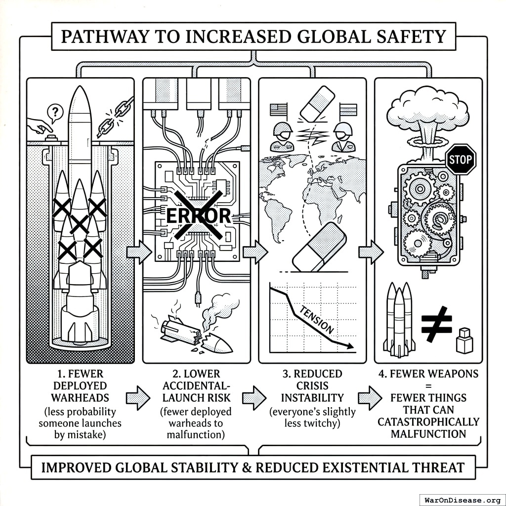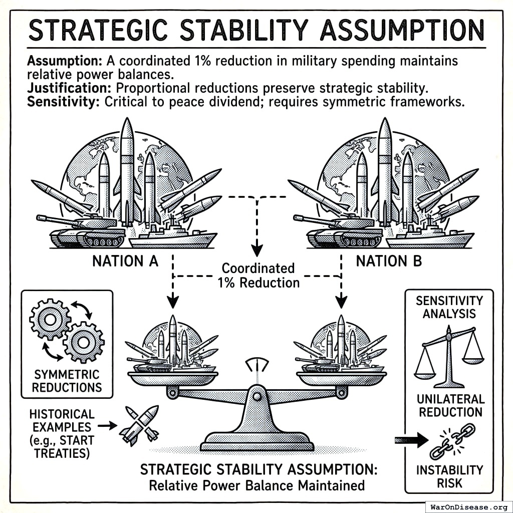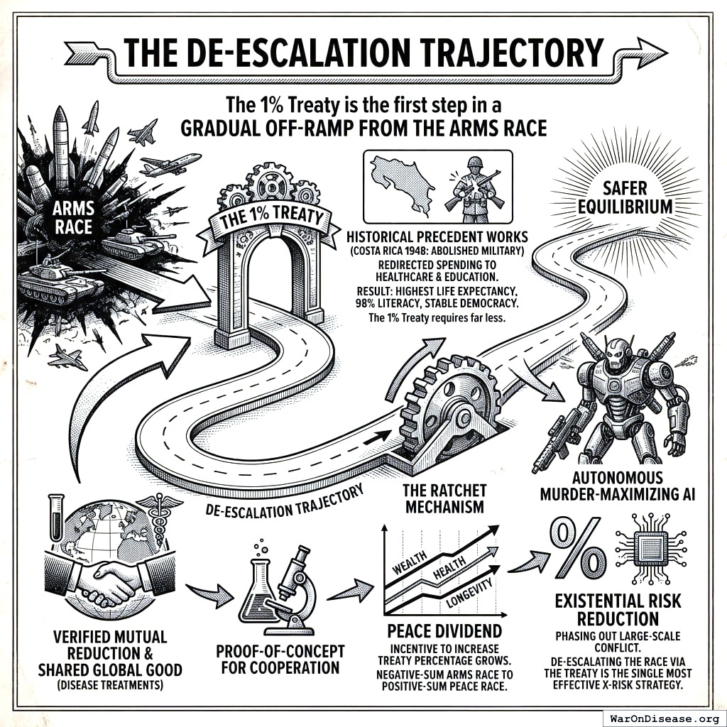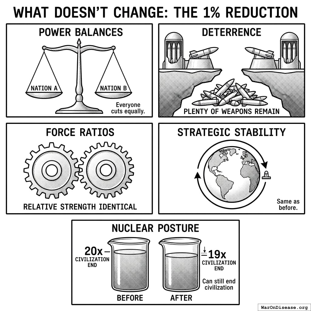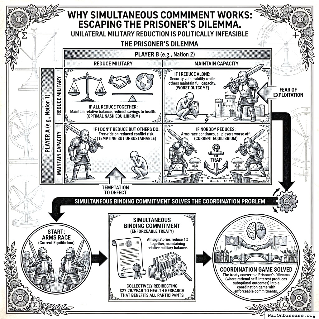 Simultaneous binding commitment solves the coordination problem: All signatories reduce 1% together, maintaining relative military balance while collectively redirecting $27.2B/year to health research that benefits all participants. The treaty converts a Prisoner’s Dilemma (where rational self-interest produces suboptimal outcomes) into a coordination game with enforceable commitments.