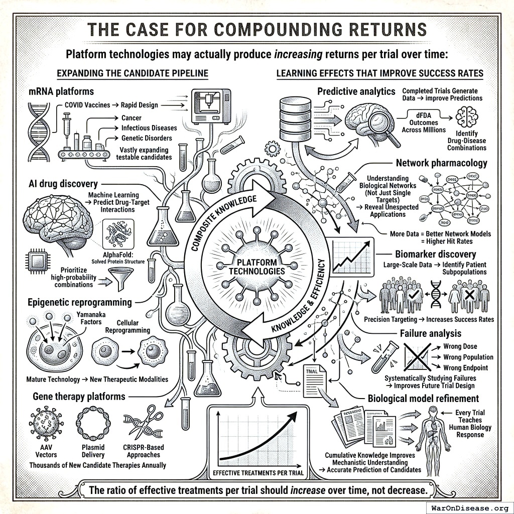 These successes share common features: systemic interventions that address root causes rather than symptoms, positive externalities that compound over time, and political consensus achieved through demonstrated value. They also share a critical limitation: they targeted specific diseases or conditions. No historical intervention has systematically accelerated the discovery process itself.