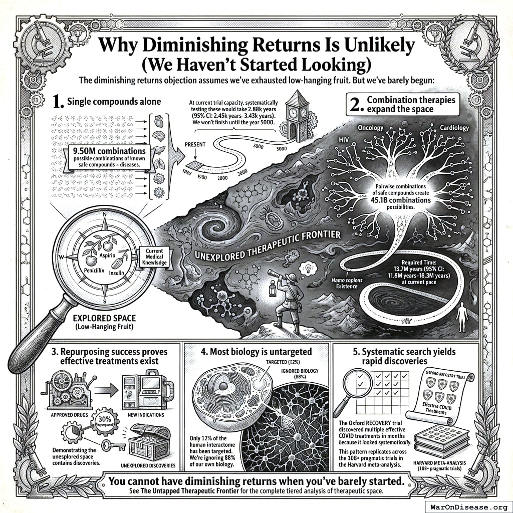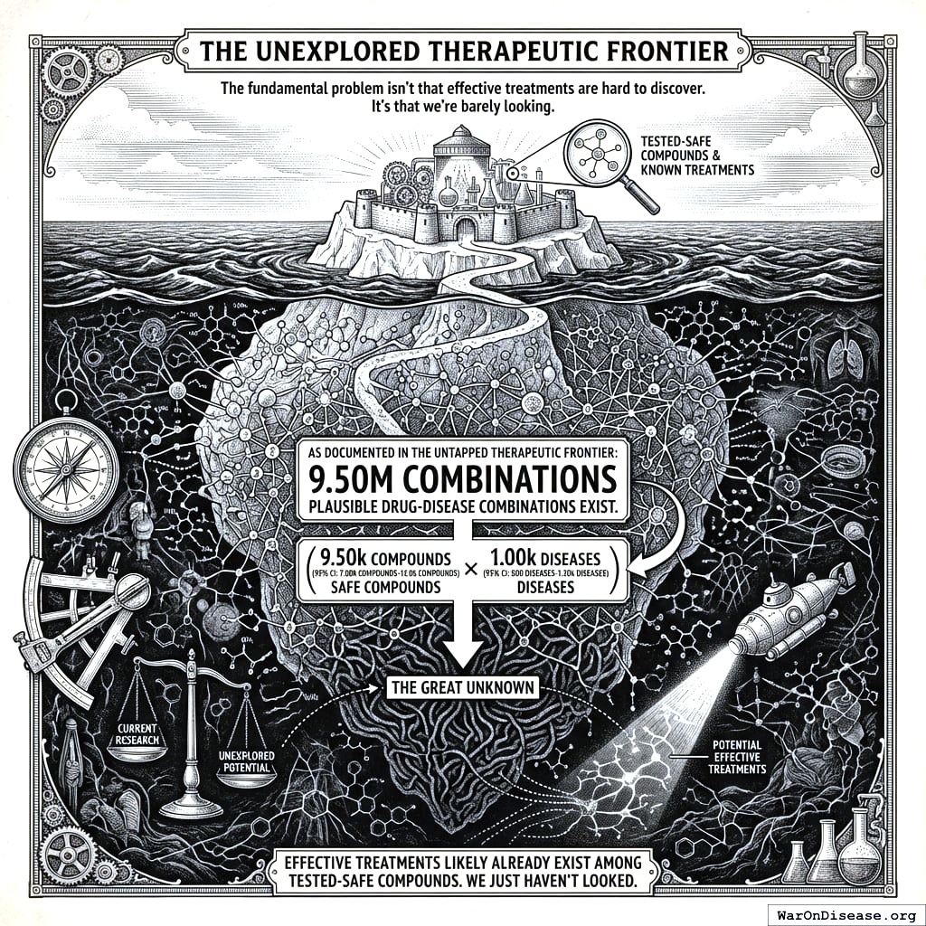 The bottleneck: Approximately 6.65 thousand diseases (95% CI: 5.7 thousand diseases-8.24 thousand diseases) have zero FDA-approved treatments. At current trial capacity (~15 diseases/year (95% CI: 8 diseases/year-30 diseases/year) new treatments/year), systematically testing all 9.5 million combinations plausible drug-disease combinations would take ~443 years (95% CI: 324 years-712 years). Effectively never.
