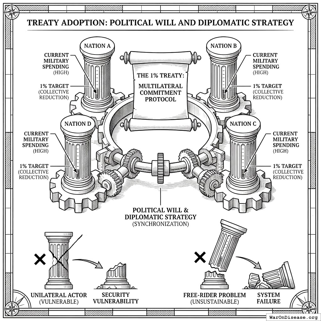 International treaty adoption is fundamentally a political and diplomatic process, not a technical implementation timeline. The 1% Treaty’s viability depends on simultaneous multilateral commitment: no nation reduces military spending unilaterally, creating security vulnerabilities or free-rider problems. All signatories reduce together.