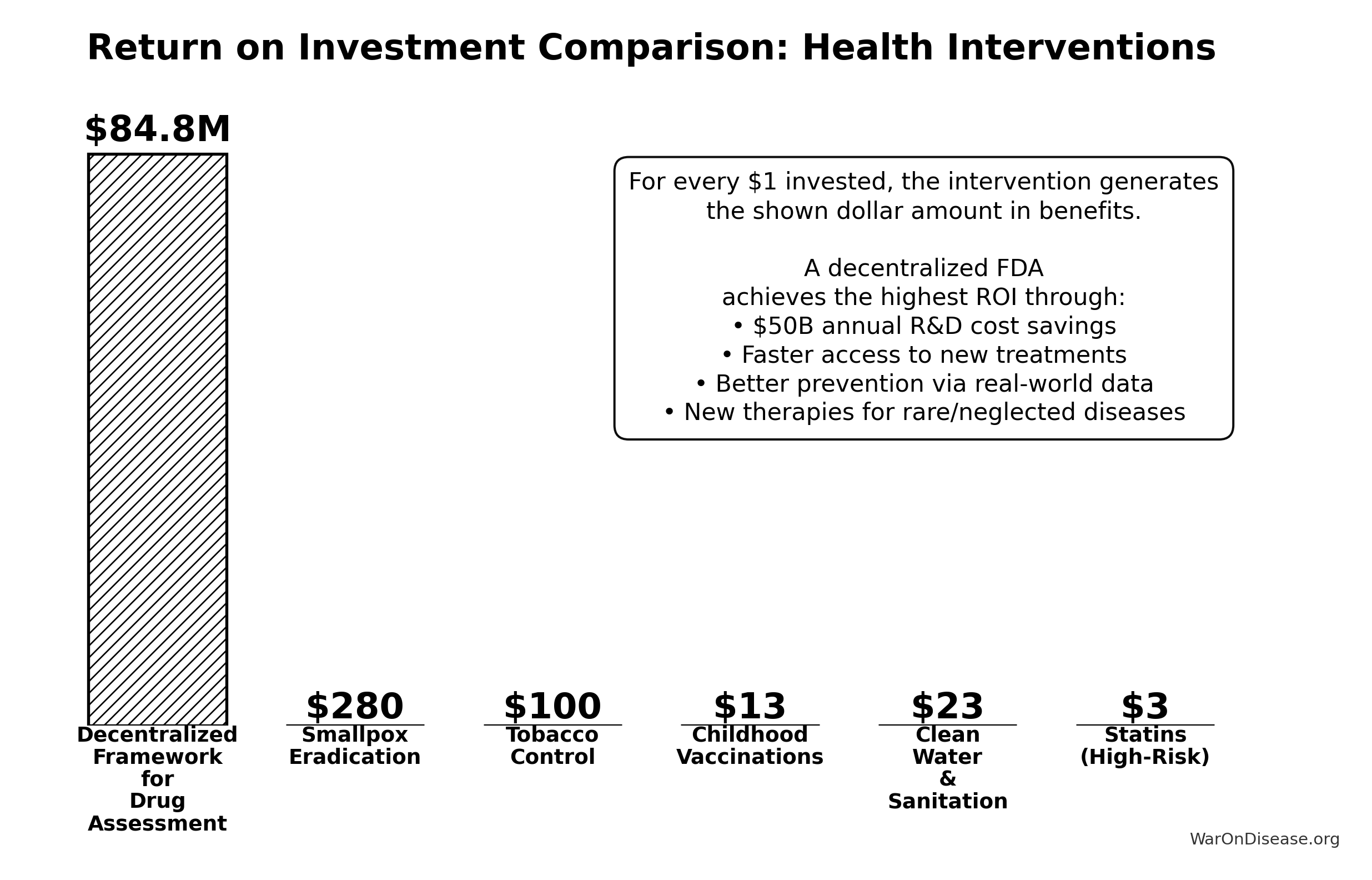 1. Smallpox eradication (1967-1980): 280:1 ROI96, eliminating a disease that killed 300-500 million people in the 20th century alone