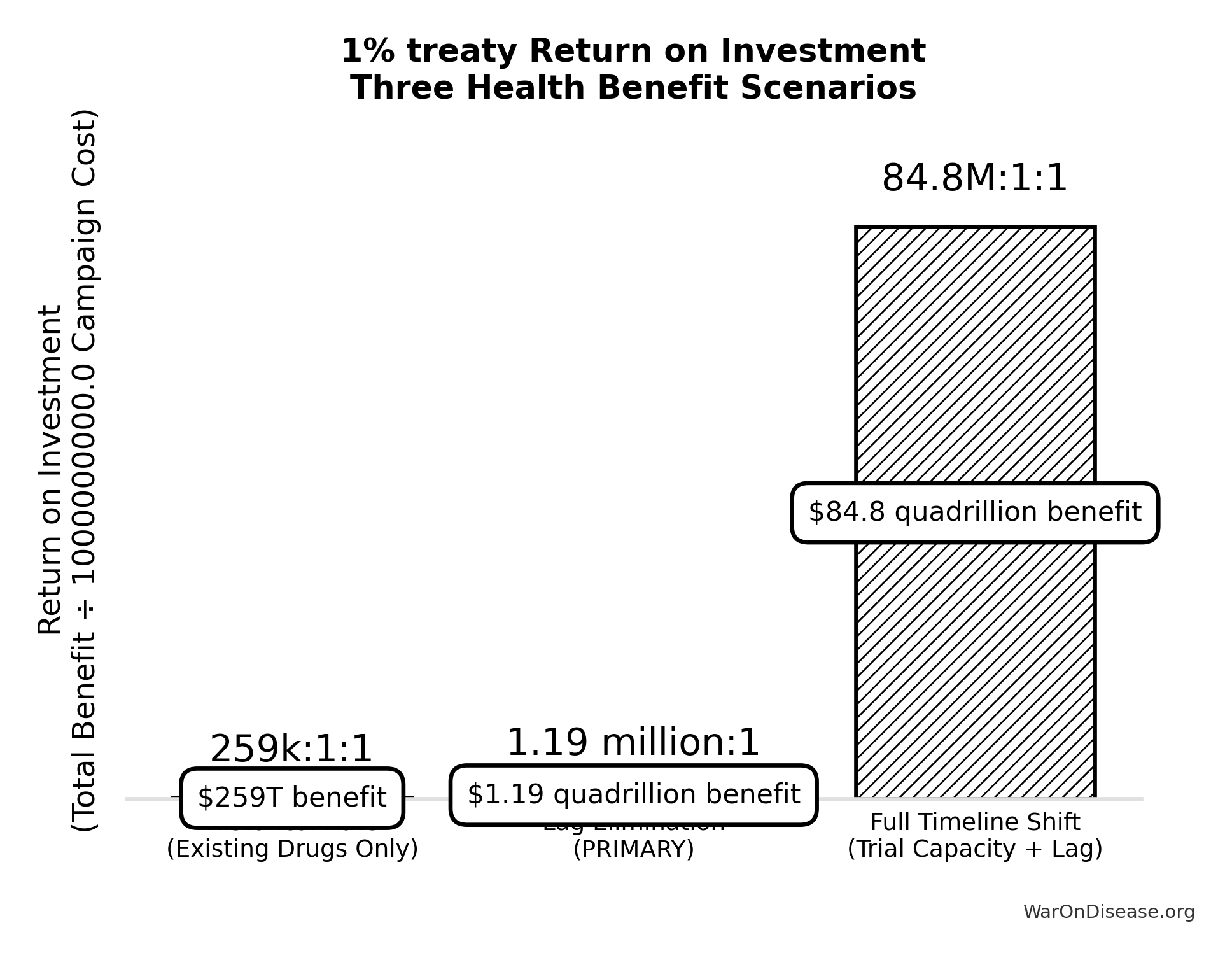 Redirect 1% of military spending ($27.2B/year) to pragmatic clinical trials. Trial capacity jumps 12.3x (95% CI: 4.2x-61.4x). Search space explored in ~36 years (95% CI: 11.6 years-77.1 years) instead of centuries. Average treatment reaches patients 212 years (95% CI: 135 years-355 years) sooner. Timeline shift saves 10.7 billion deaths (95% CI: 7.4 billion deaths-16.2 billion deaths), valued at $84.8 quadrillion (95% CI: $62.4 quadrillion-$97.3 quadrillion).