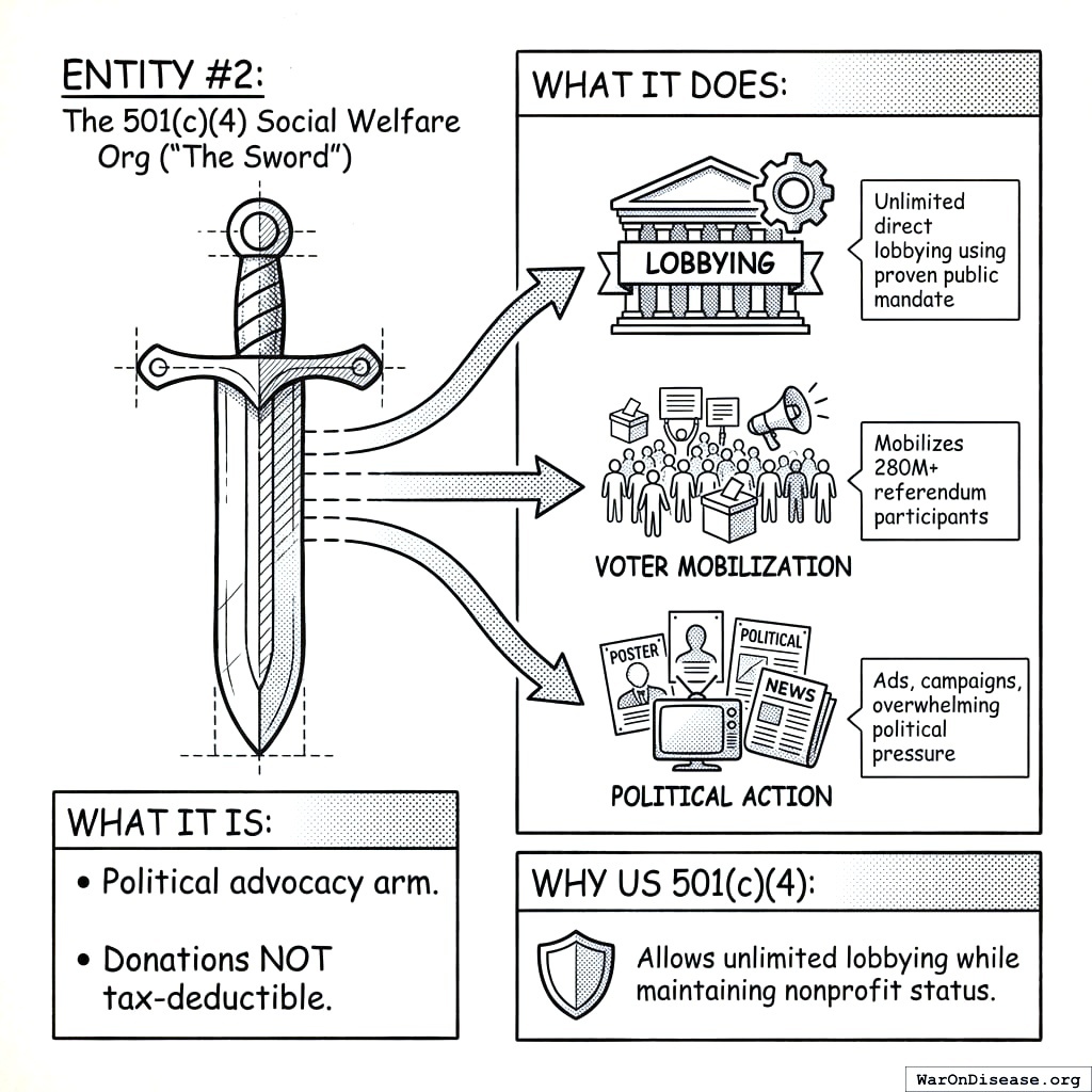 What kind of organization fits: A purpose-built 501(c)(4) social welfare organization paired with a for-profit Victory Corporation, modeled on the ACLU, NRA, or Planned Parenthood structure. These organizations have been running the same legal playbook for decades. The only difference is the target: diseases instead of guns, reproductive rights, or civil liberties.