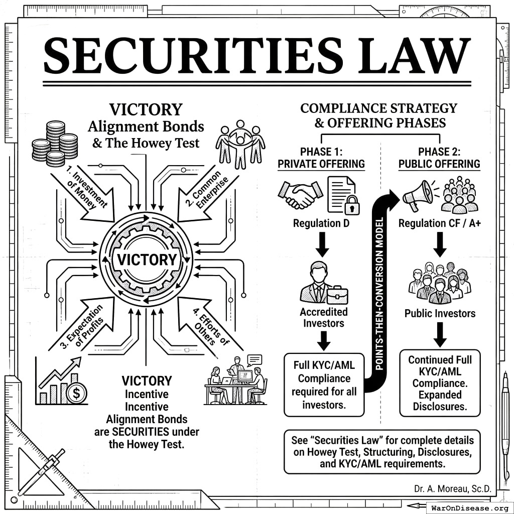 The plan: start with Regulation D (rich people only, because your laws allow rich people to lose money on speculative investments but protect poor people from the opportunity to make money on speculative investments, which your species calls “investor protection” and I call “a very specific kind of cruelty”). Expand to Regulation CF and A+ (everyone else). Full KYC/AML compliance throughout, because you need to verify that nobody uses your disease-curing bonds to launder money from their disease-causing enterprises, which is a real concern given that several of your largest industries do both simultaneously.