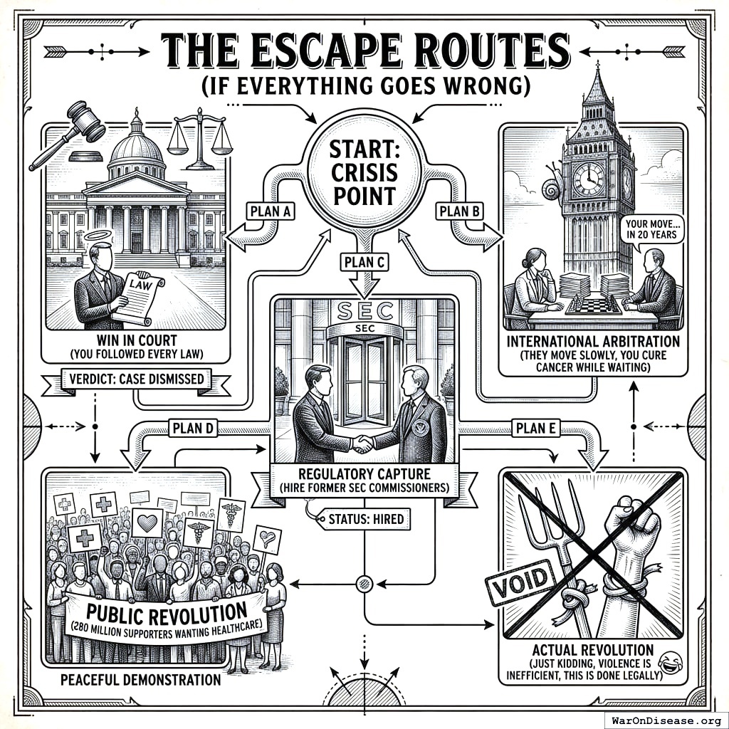 When you threaten trillion-dollar industries by curing disease cheaply, powerful people notice. They notice the way a bear notices you’ve sat on its children. The question is not whether they’ll attack. The question is which attack vector they’ll use first, and whether your lawyers bill more per hour than theirs, which is how legal disputes are actually decided on your planet, despite what they teach in law school.