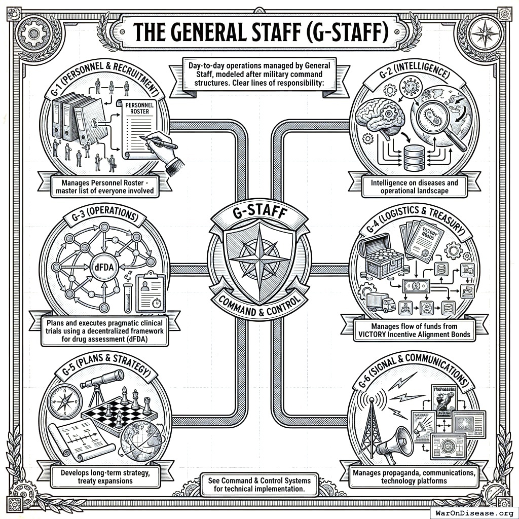 The organizational structure borrows from your military, because your military is the only institution on Earth that has successfully coordinated millions of humans toward a single objective, even if that objective was the wrong one. G-1 handles personnel (keeping track of humans, which is harder than it sounds). G-2 handles disease intelligence (deciding which diseases die next, which is a sentence your species should have been saying for decades but wasn’t because nobody was coordinating). G-3 handles operations, running your decentralized FDA clinical trials, which is the only part that actually cures anything. G-4 handles logistics and treasury, managing your VICTORY Bond money (counting it, moving it, resisting the urge to steal it, which requires a surprising amount of institutional design). G-5 handles plans and strategy, thinking about next year while everyone else panics about next quarter. And G-6 handles signal and communications, which is propaganda, which is the reason you’re reading this instead of doing something useful.