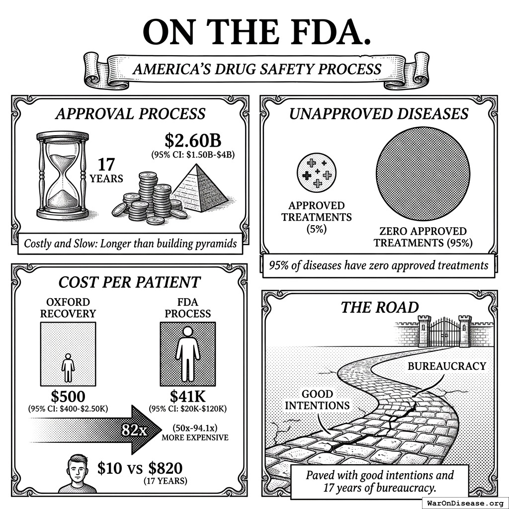 The FDA makes drugs 82x (95% CI: 50x-94.1x) times more expensive than necessary. It takes 14 years (95% CI: 12 years-17 years) and $2.6B (95% CI: $1.5B-$4B) to get a drug from discovery to patient. That’s longer than it took to build the pyramids. The pharaohs didn’t have to file quarterly progress reports in triplicate. Ninety-five percent of diseases have zero approved treatments because the FDA is excellent at preventing any drugs from reaching people.