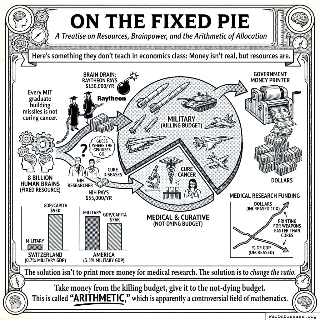 Money isn’t real, but resources are. Earth has 8 billion human brains. Every MIT graduate building missiles is not curing cancer. Every brilliant physicist designing warheads is not designing MRI machines. You have a fixed number of geniuses. You are using them to build things that kill other geniuses. Switzerland spends 0.7% of GDP on military and has $93K GDP per capita. America spends 3.5% and has $76,000.