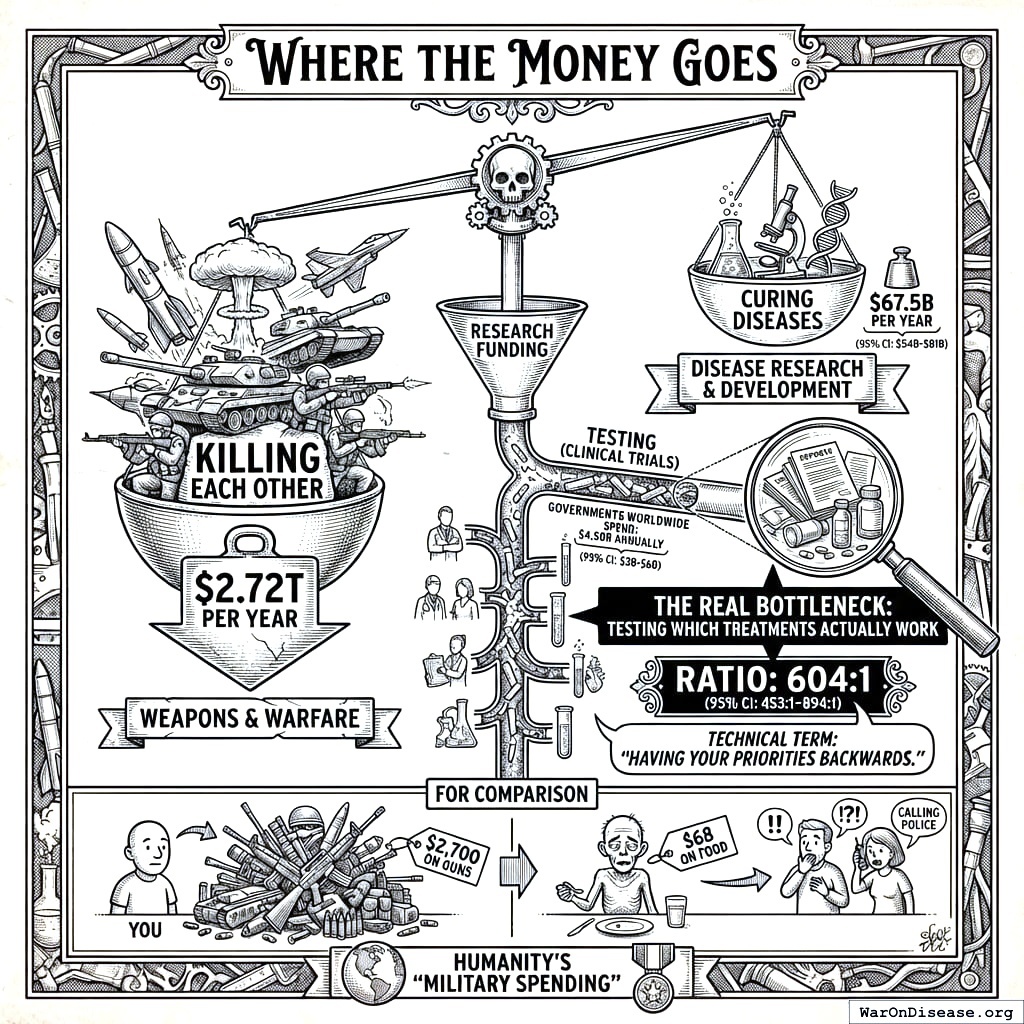 Of its $47B (95% CI: $45B-$50B) annual budget, only 3.3% (95% CI: 2%-5%) goes to actual drug trials in humans. The other 97% goes to studying mice, building buildings, and publishing papers nobody reads. The system operates at 2% of its potential capacity to save lives.