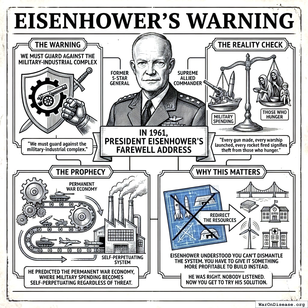 Why this matters: Eisenhower understood you can’t dismantle the system. You have to give it something more profitable to build. He was right. Nobody listened. You never do. Now you get to try his solution: redirect the resources.
