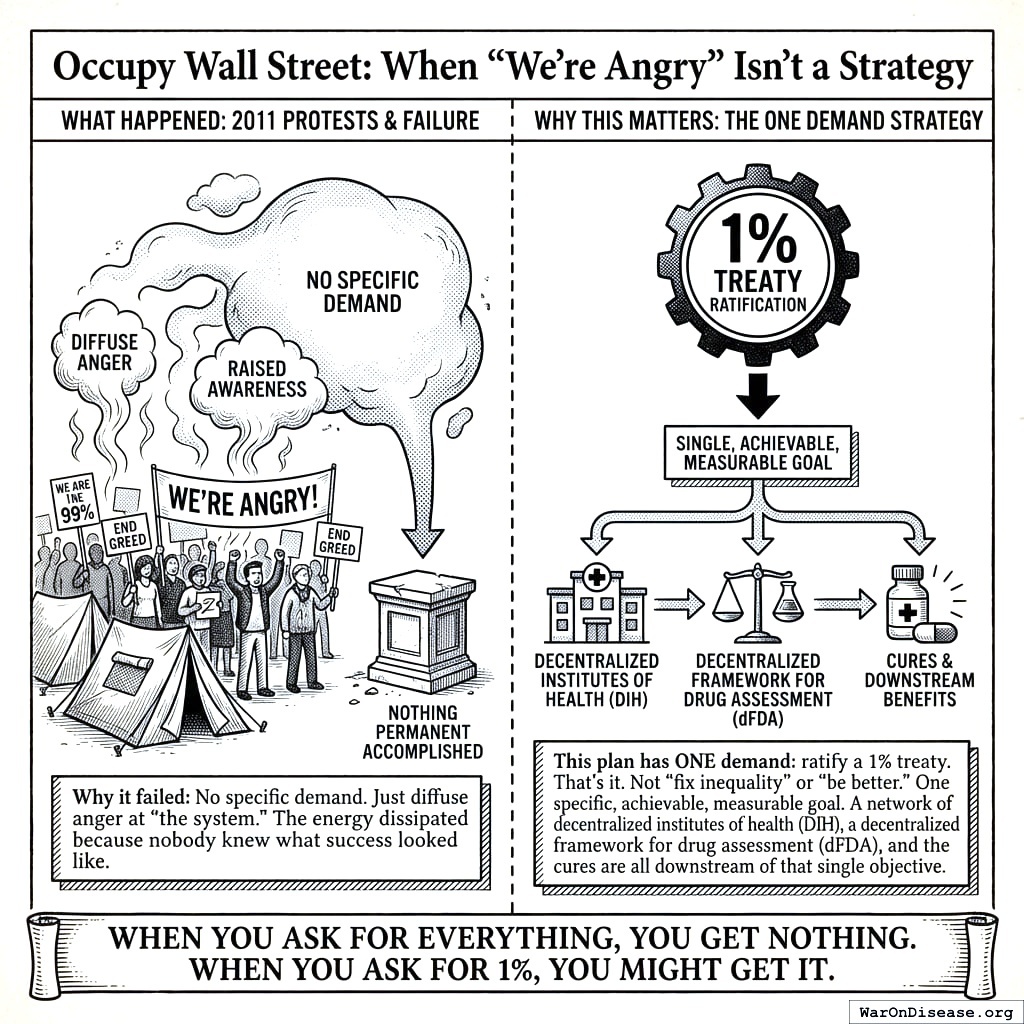 Why this matters: This plan has ONE demand: ratify a 1% Treaty. That’s it. Not “fix inequality” or “be better.” One specific, achievable, measurable goal. You want to change one number from 0 to 1. Ambition is inspiring, but subtraction is effective. A network of Decentralized Institutes of Health (DIH), a decentralized FDA158,159, and the cures are all downstream of that single objective.
