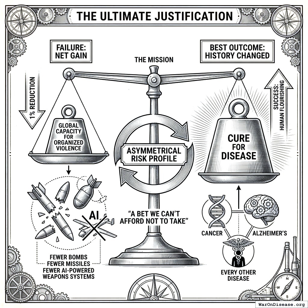 10.5281/zenodo.18161560 6.65 thousand diseases have zero FDA-approved treatments; at current trial capacity, exploring them takes 443 years. Redirecting 1% of military spending scales capacity 12.3x, cutting the timeline to 36 years and preventing 10.7 billion deaths. At $0.00177/DALY, 50.3kx more cost-effective than the best existing interventions. Incentive Alignment Bonds make adoption politically viable.