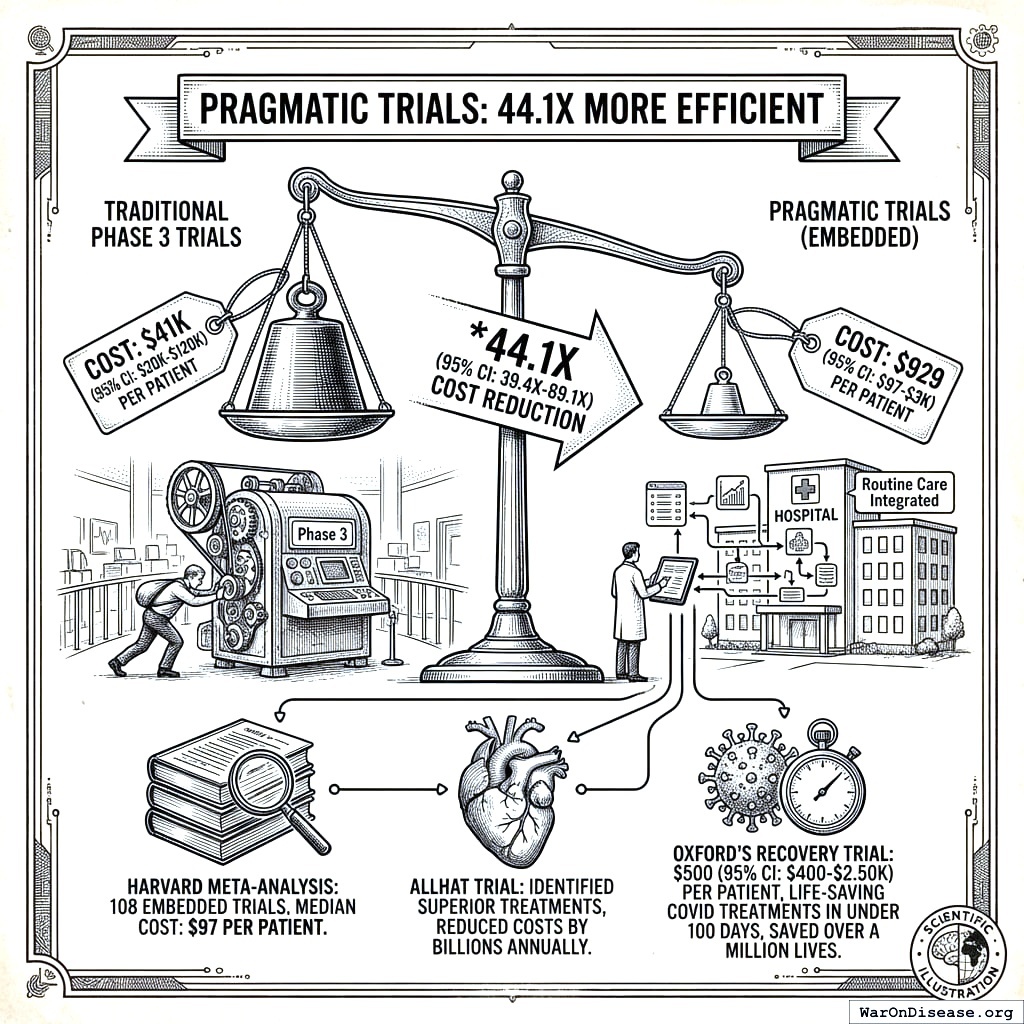 Traditional Phase 3 trials cost $41K (95% CI: $20K-$120K)108. Pragmatic trials embedded in routine care cost $929 (95% CI: $97-$3K)1, a 44.1x (95% CI: 39.4x-89.1x) cost reduction.
