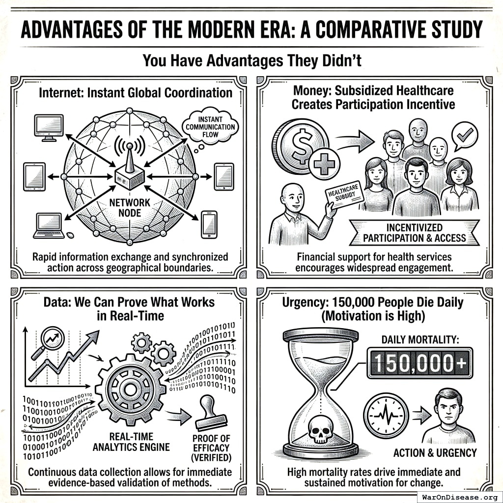The formula worked: mix moral incentives (patriotism) with financial self-interest (interest payments). You’re applying it to a different war: the one against your own mortality. When saving the world is profitable, people trip over each other to fund it.