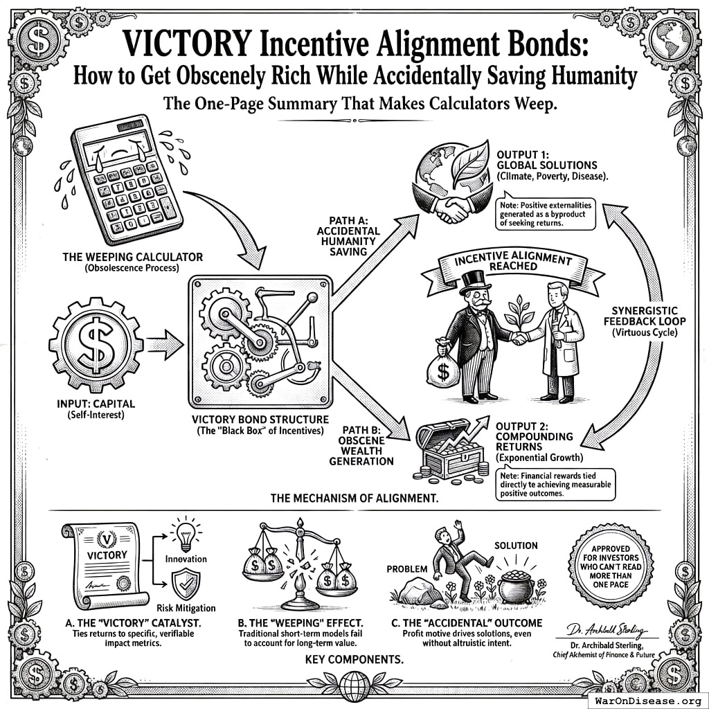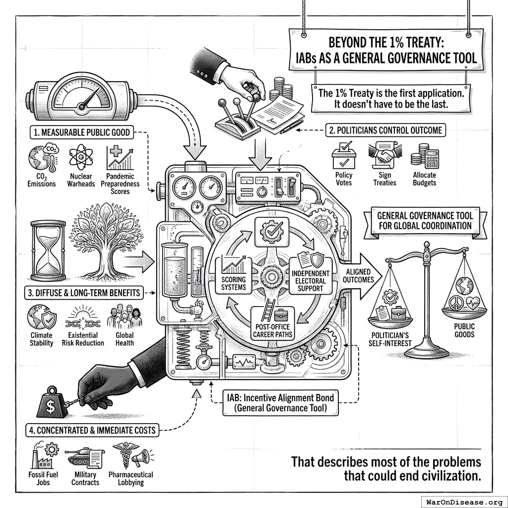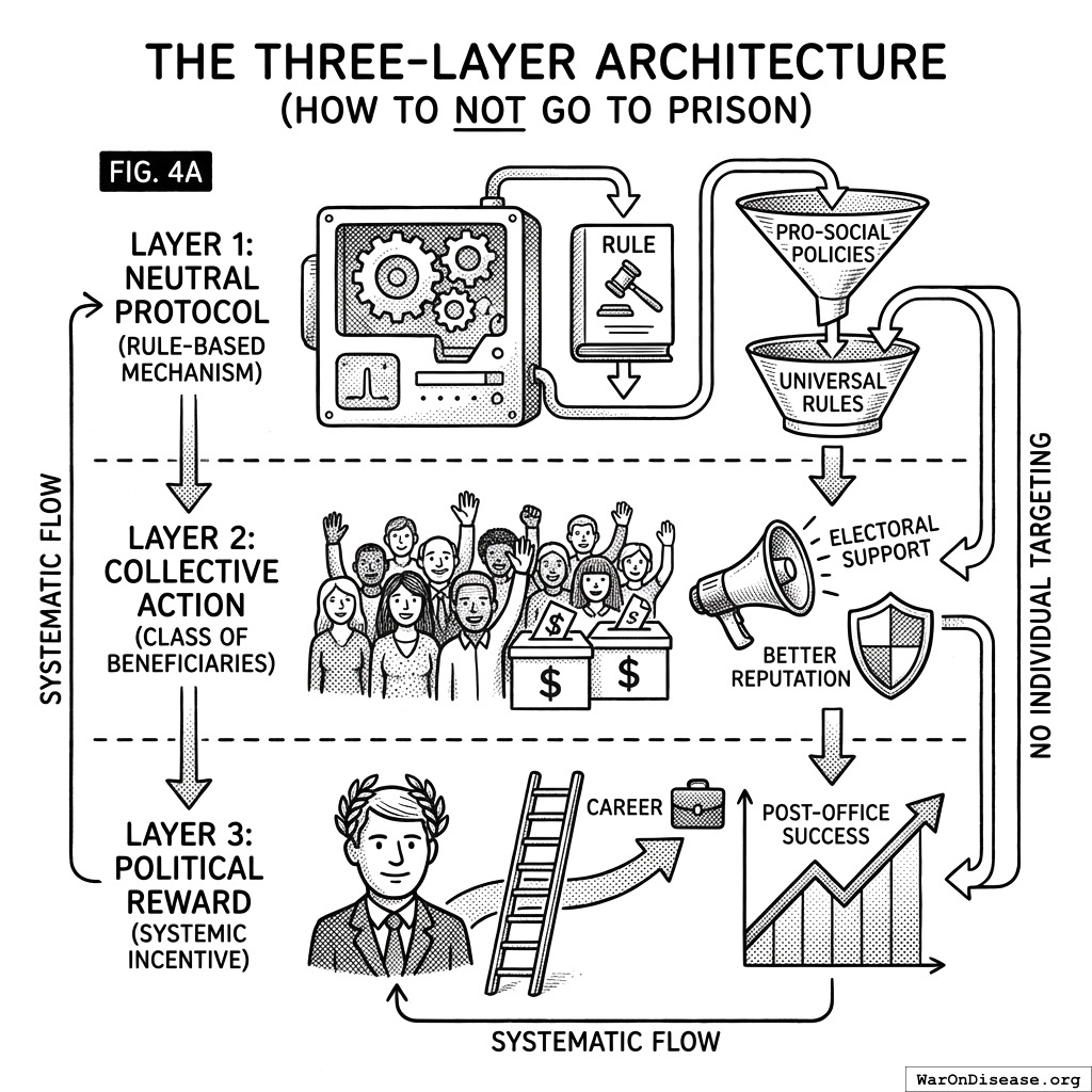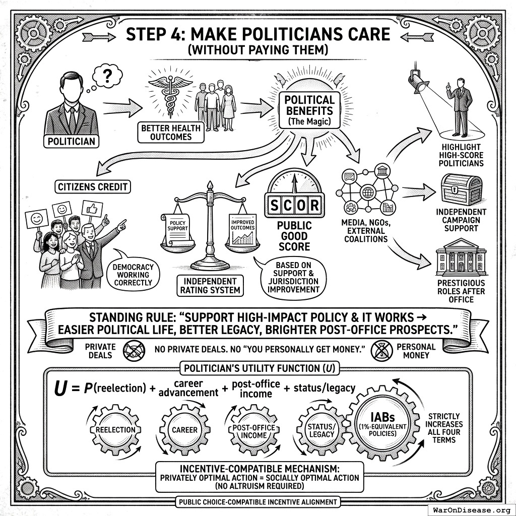 The fix: tell every politician on Earth, “Vote for a 1%-style reform and you get better reelection odds and a Goldman Sachs board seat when you retire.” No backroom deals. No suitcases of cash. Just a standing, public rule: do the right thing, get rewarded. Nobody has to become a better person. The money just circulates until diseases stop existing.