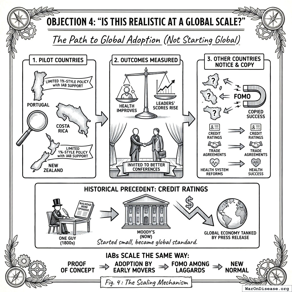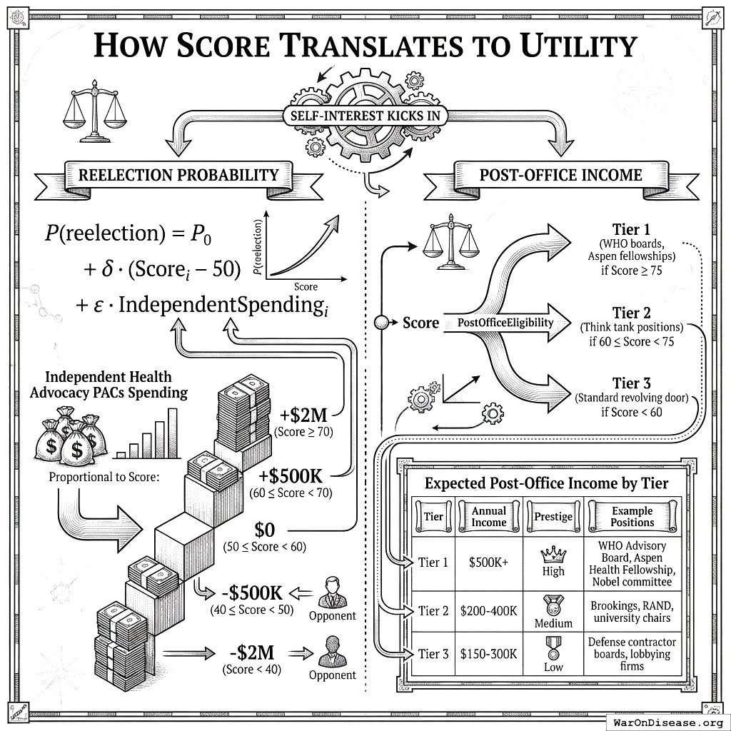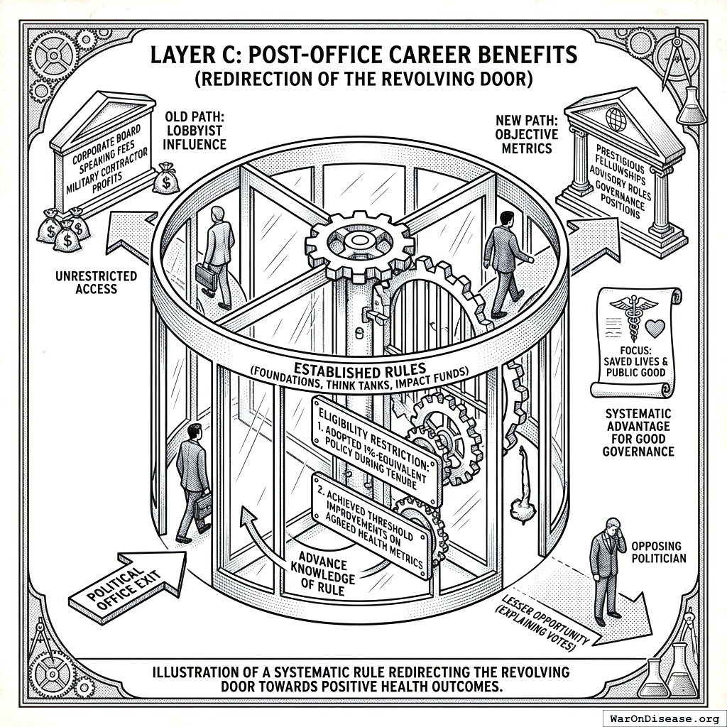 Foundations and think tanks set eligibility rules: score above X gets you WHO boards and Aspen fellowships. Below X, you’re explaining at dinner why you voted against curing diseases. The revolving door, but spinning toward “saved lives” instead of toward whoever paid the most lobbyists.