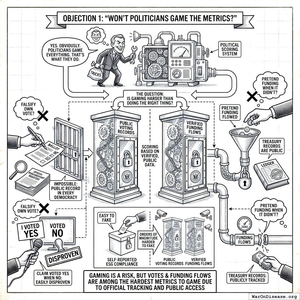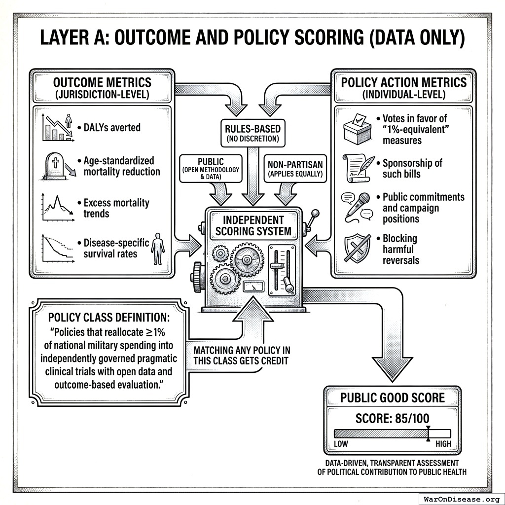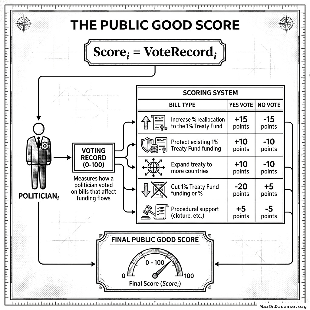 An independent org assigns each politician a Public Good Score based on votes, sponsorship, and funding flows. Scores cover a policy class (any >=1% military-to-health reallocation), not a specific bill. Public, rules-based, non-partisan. For the 1% Treaty, this is called the Treaty Support Score. (See the Senator Smith example for how scores translate to concrete payoffs.)