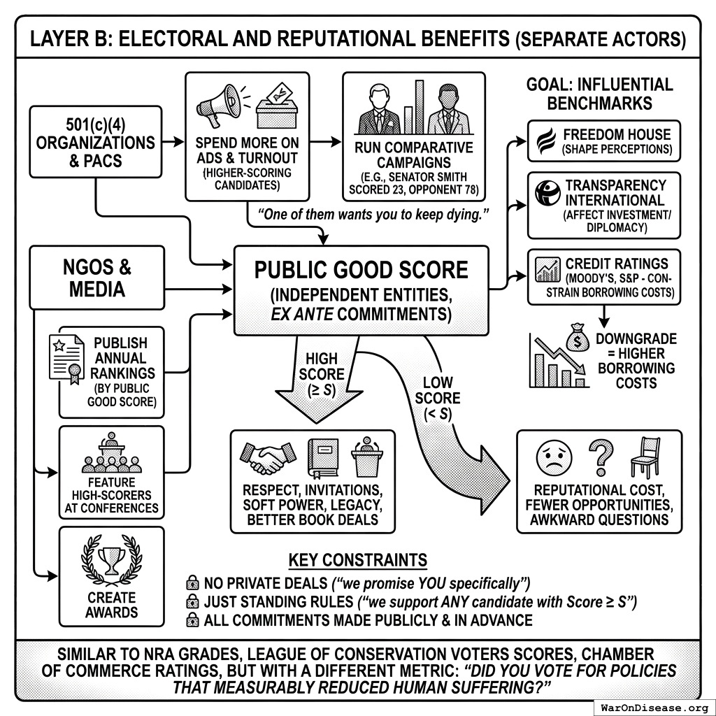 You cannot legally say “support Bill #XYZ123 and get paid.” That’s bribery. But you can create a system where politicians who support a class of pro-social policies systematically get more of everything they want. The trick: rule-based, universal, announced in advance.