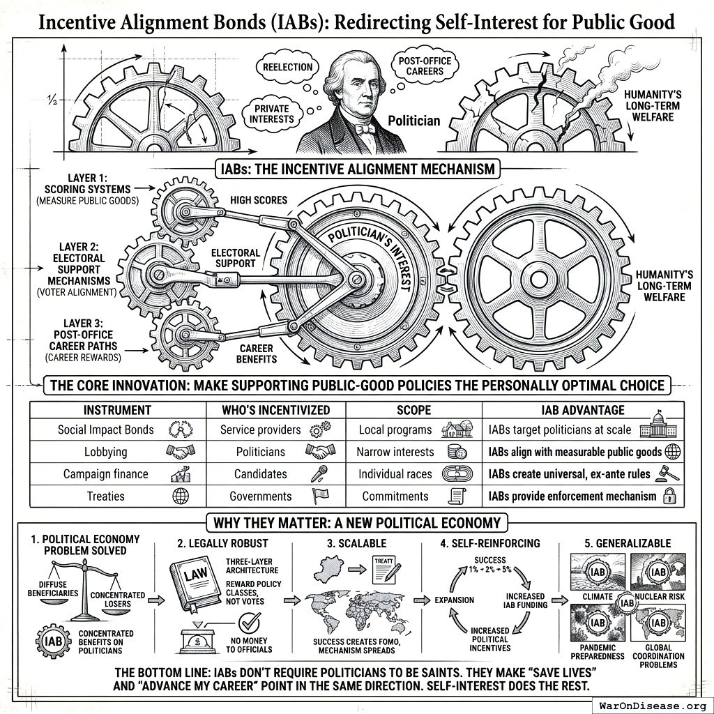 Bribery corrupts alignment. IABs create it. Wealthy actors already buy policy (pharma: $300M/year, weapons manufacturers: $127M (95% CI: $100M-$160M)/year). The question isn’t “should money influence policy?” but “can you point the money at welfare instead of warfare?”