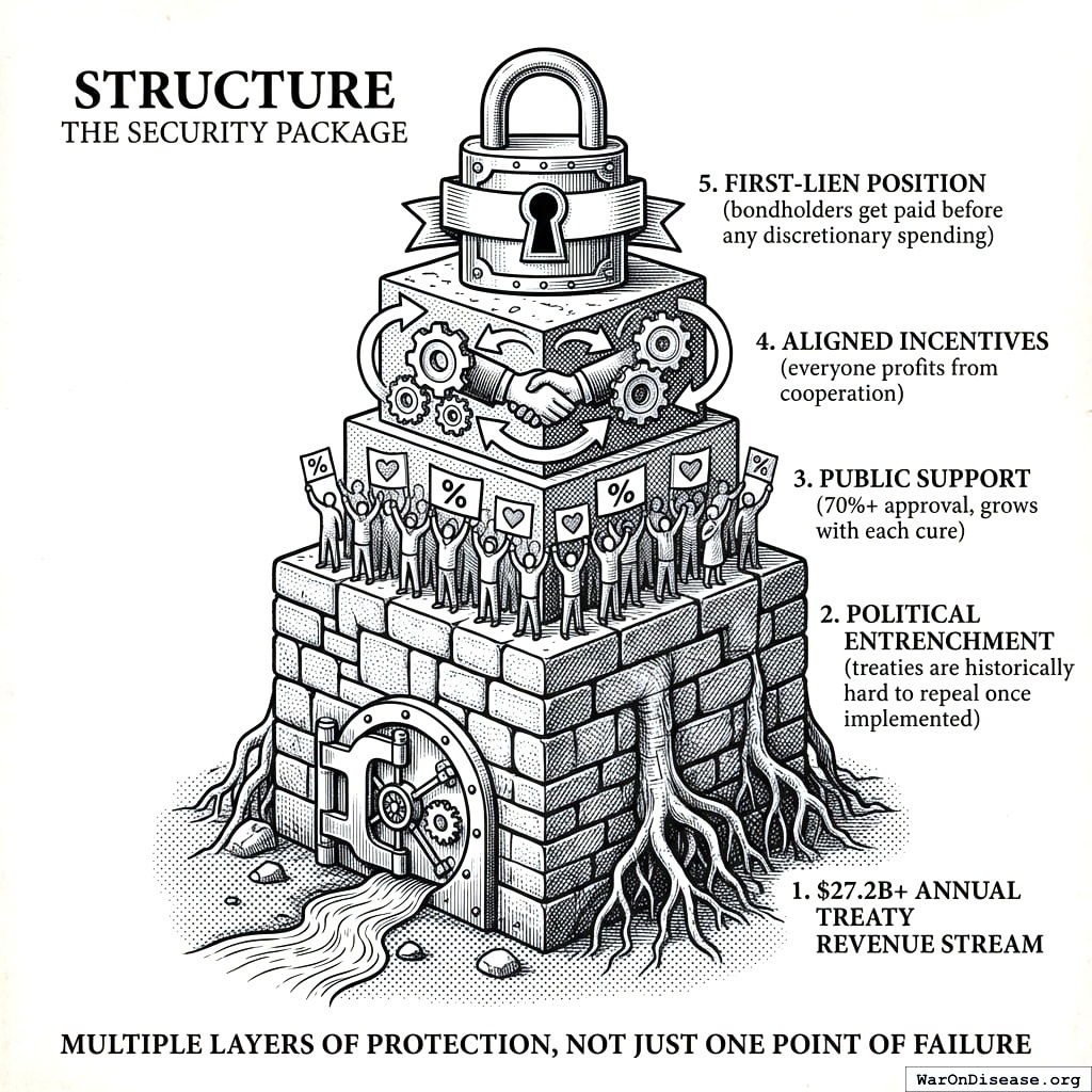 Investors buy IABs. Capital sits in a trust. It pays out if and only if public-good targets are hit. Same structure as green bonds and catastrophe bonds.