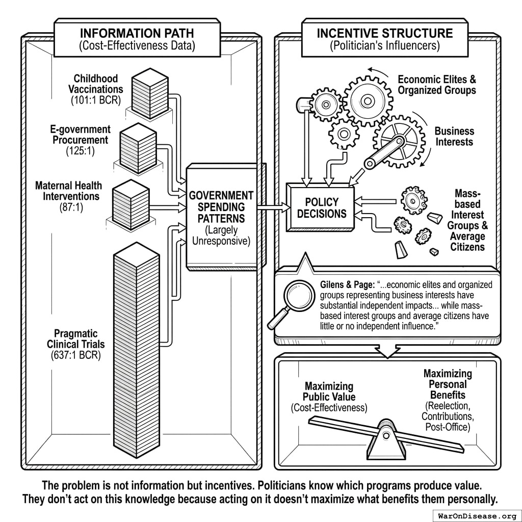 Why? Because information doesn’t change incentives. A Princeton study analyzed 1,779 policy decisions and found that average citizens have “little or no independent influence” on policy outcomes148. Economic elites and organized interest groups drive policy. You already knew this (it’s covered in Unrepresentative Democracy). The point here is that publishing better data doesn’t fix the problem. Your politicians already know which programs produce value. They don’t act because acting doesn’t maximize getting votes, getting papers, or getting a nice job afterward selling access to their replacements.